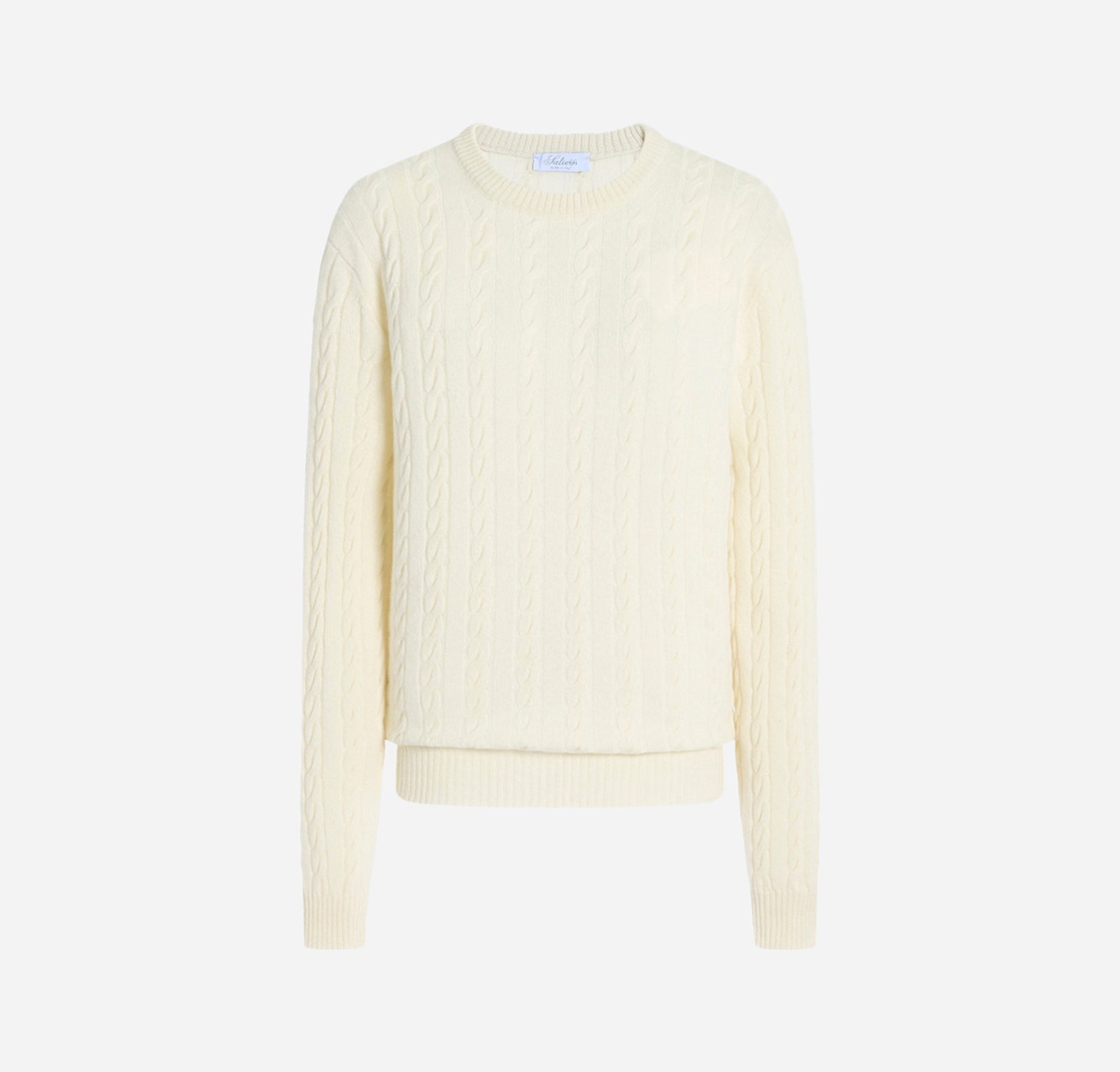 Pure cashmere crewneck sweater with cable-knit stitch, and ribbed collar, cuffs, and hem.