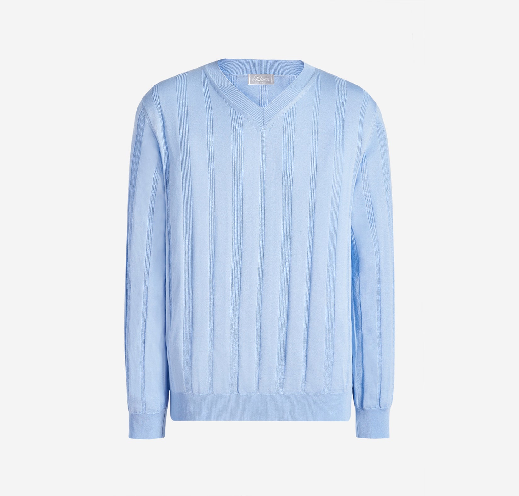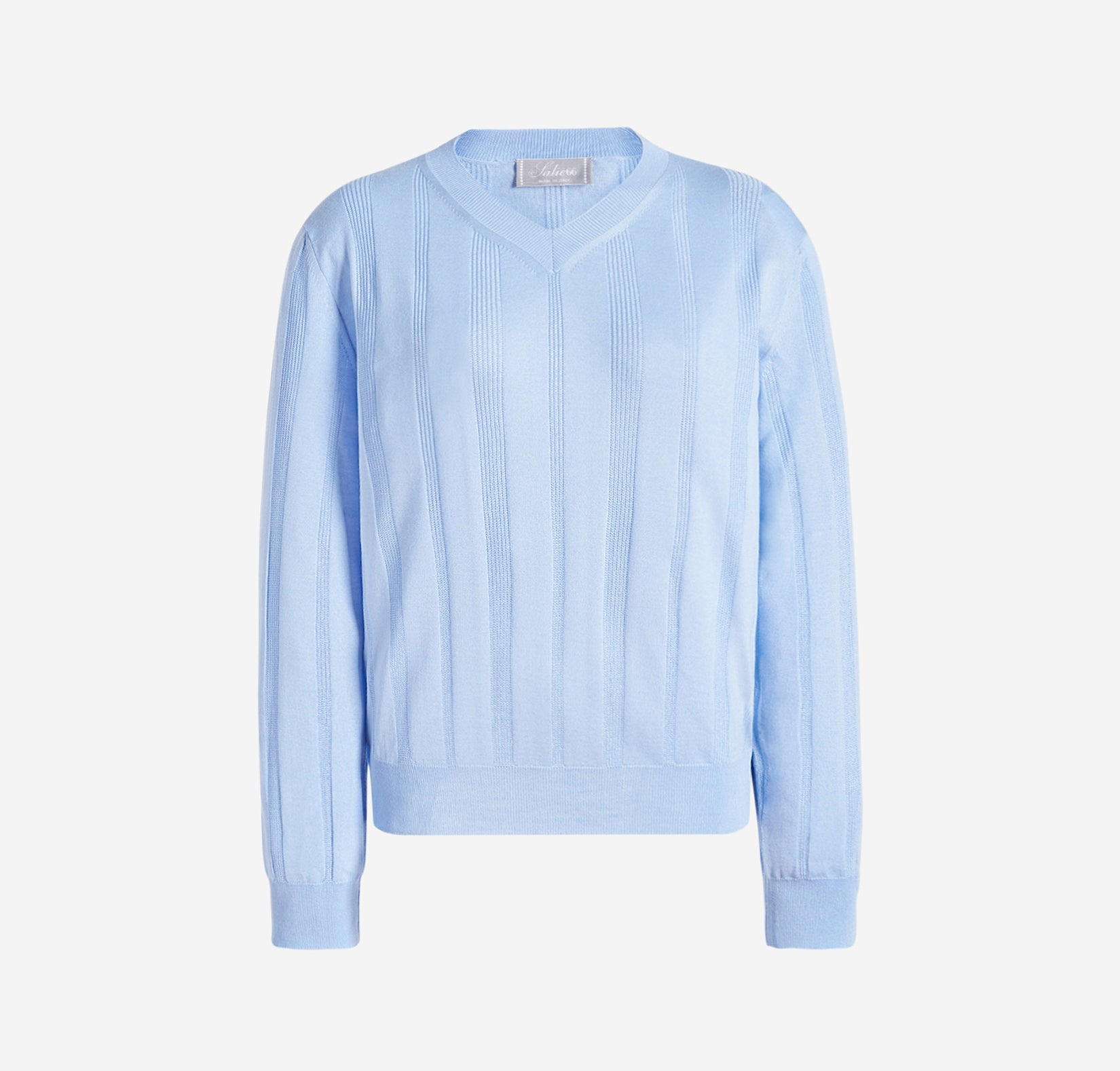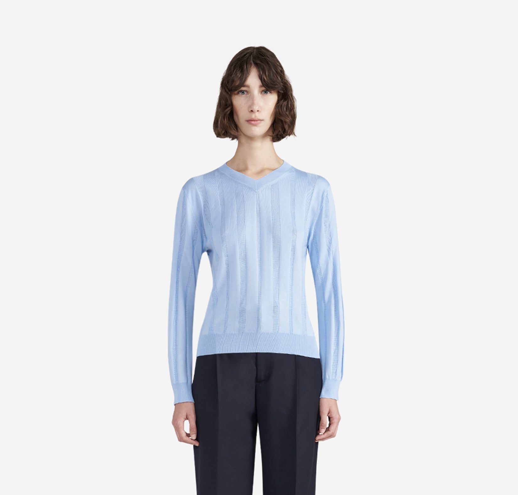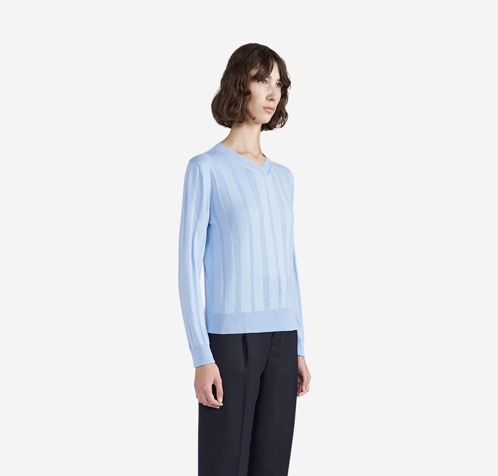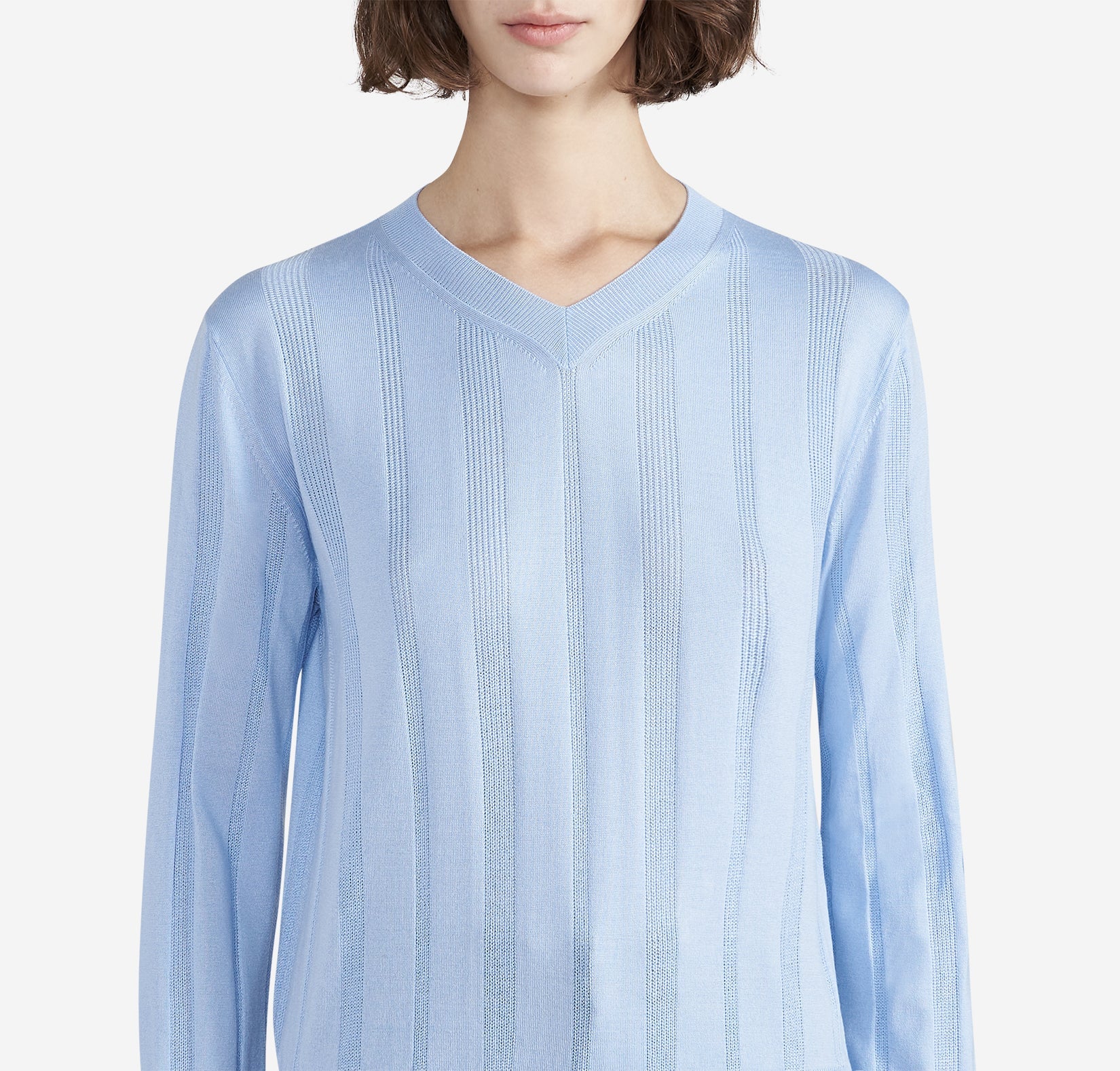 Fine knit V-neck sweater with drop stitch detail, and ribbed cuff and hem.