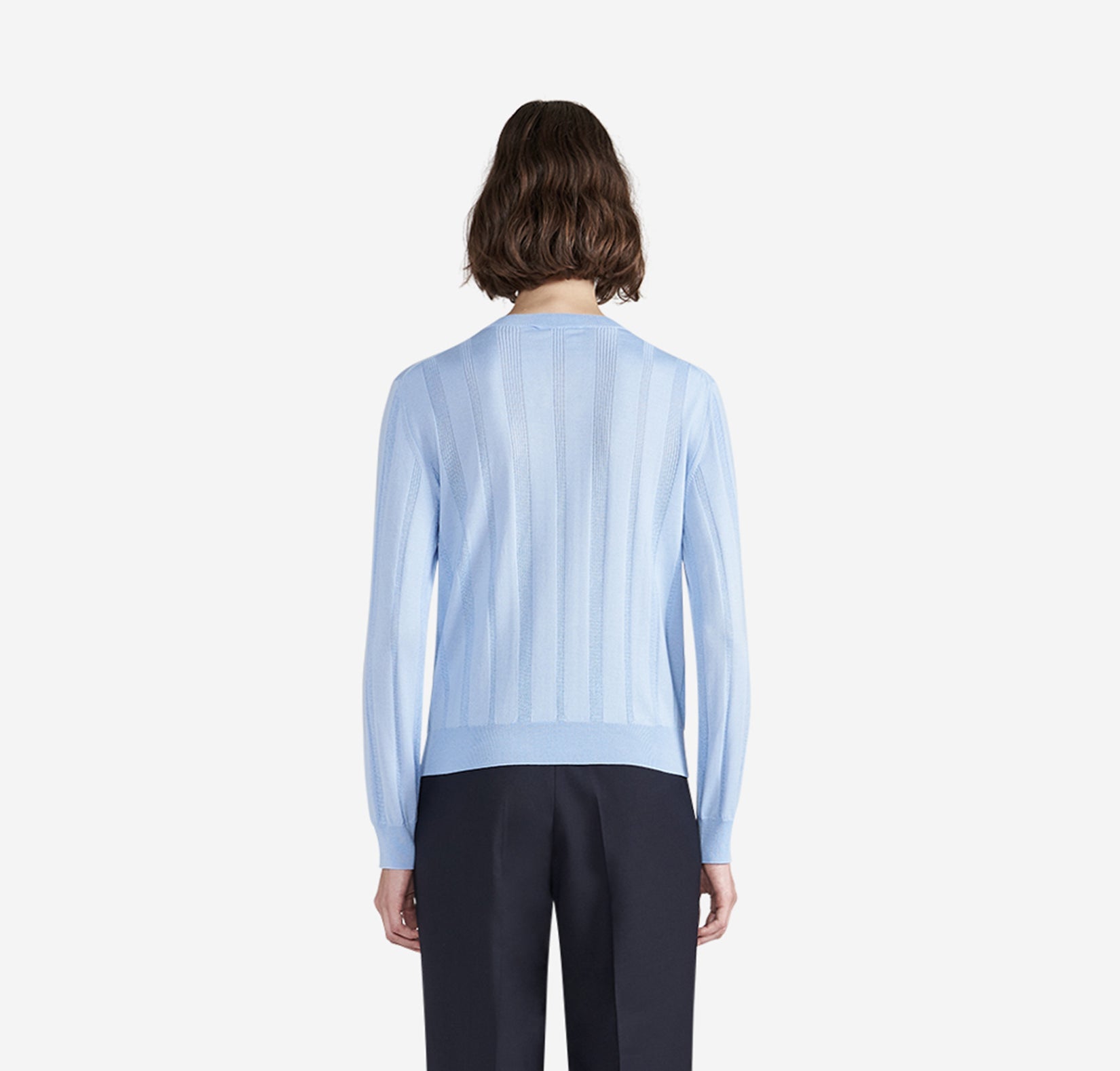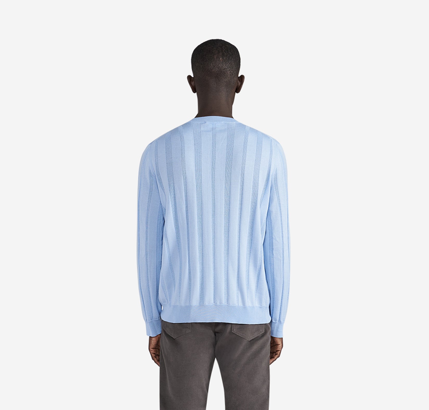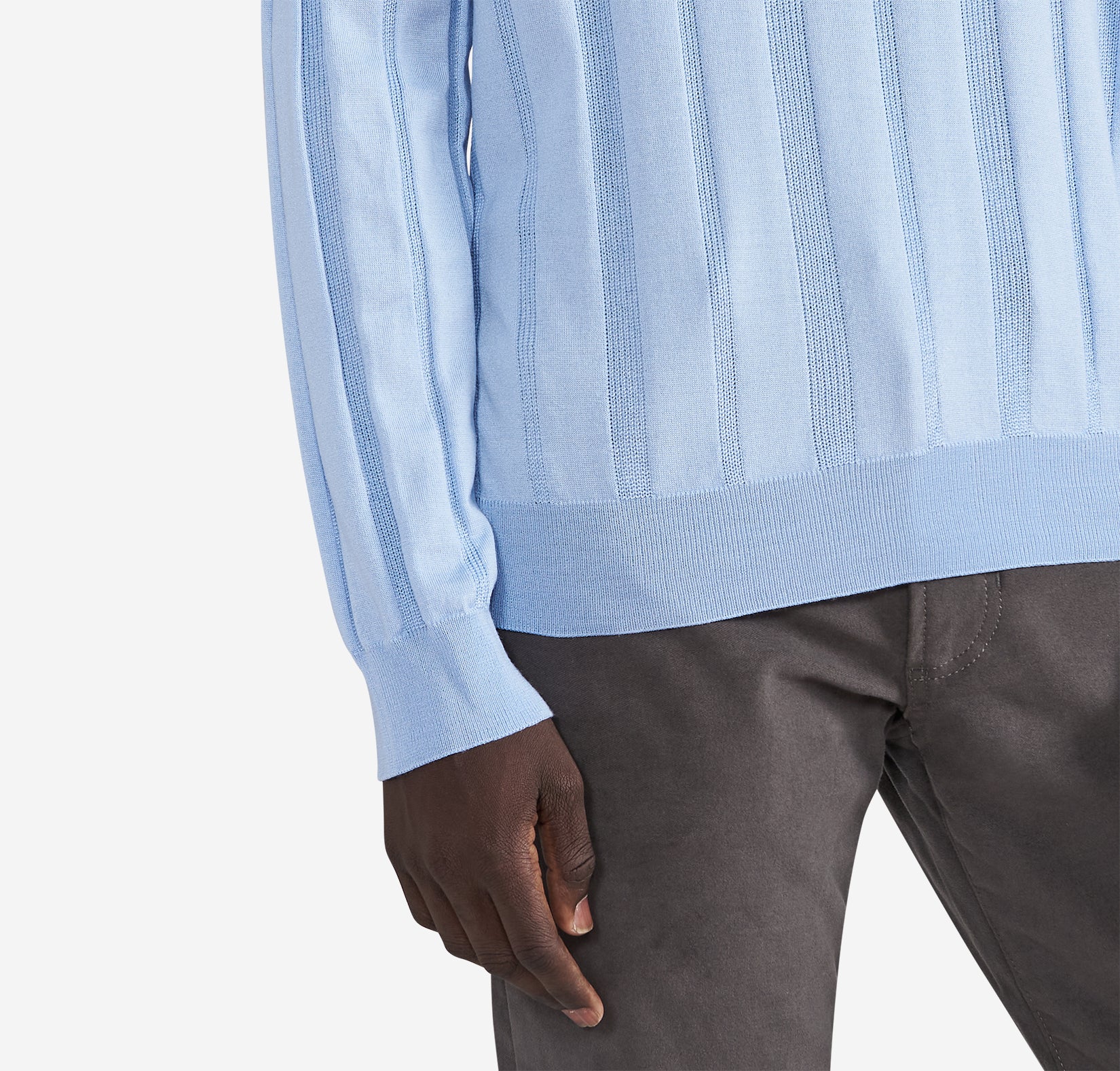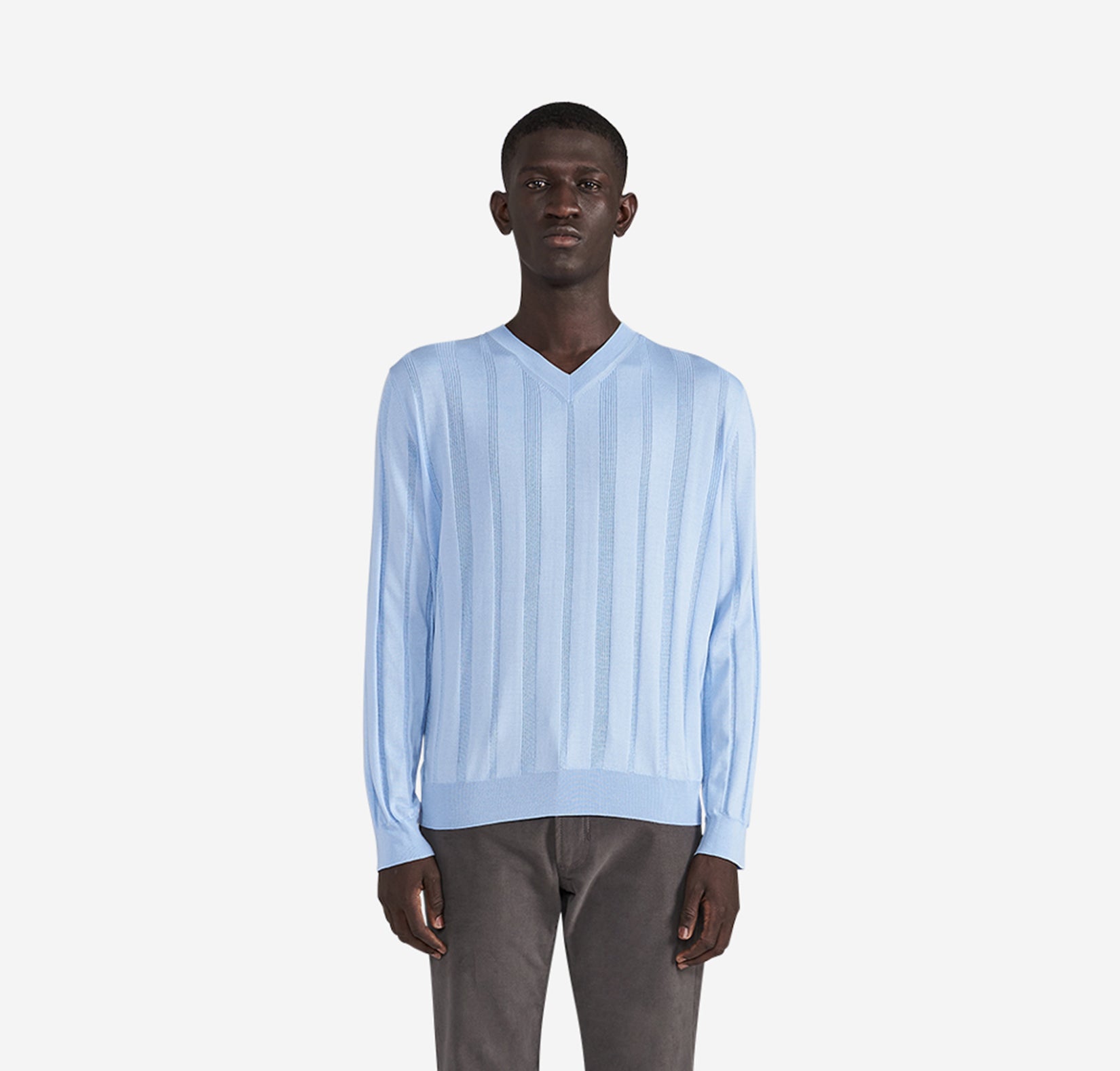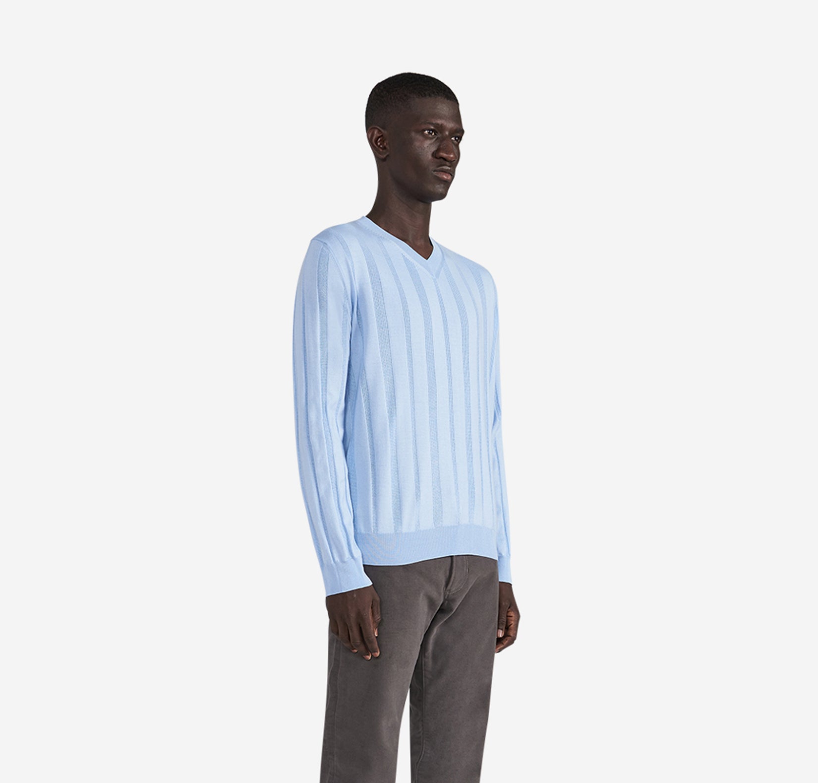 Fine knit V-neck sweater with drop stitch detail, and ribbed cuff and hem.