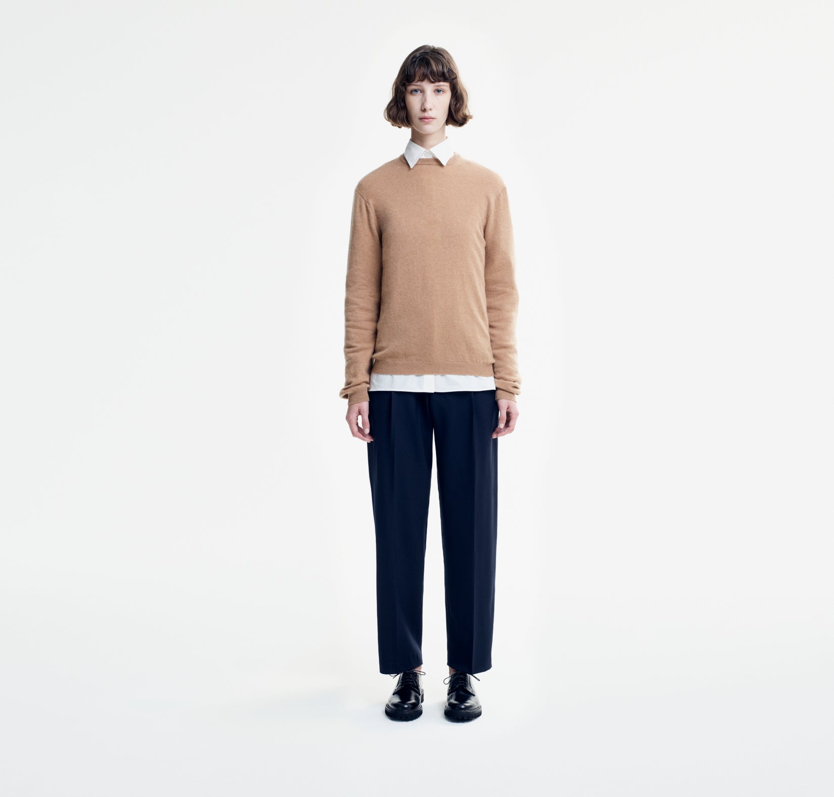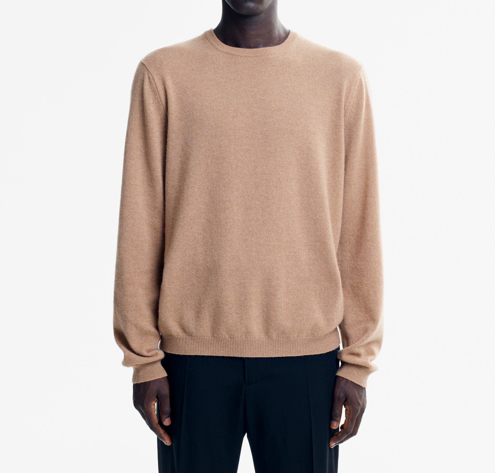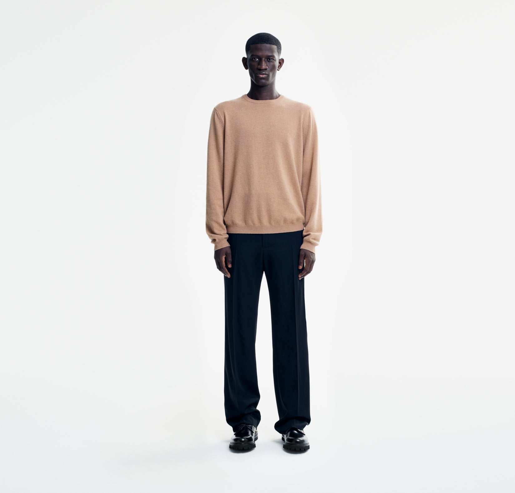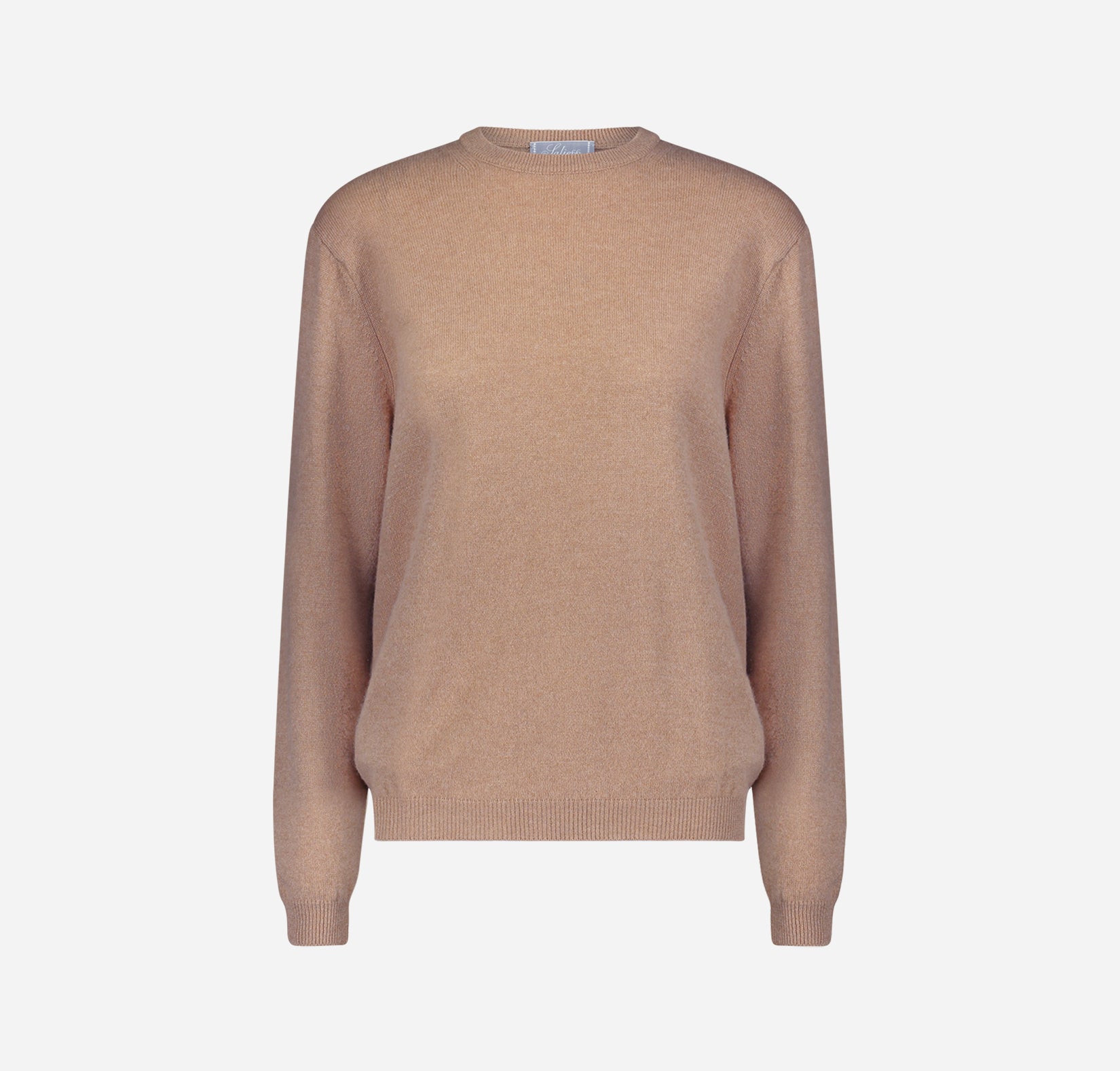 Pure cashmere crewneck sweater with ribbed collar, cuffs, and hem.
