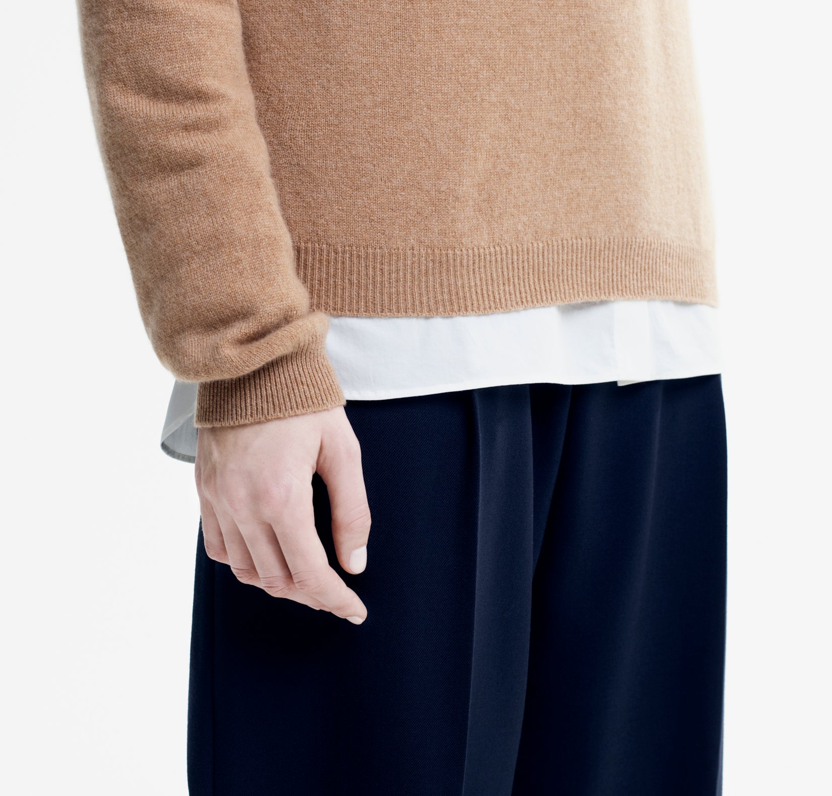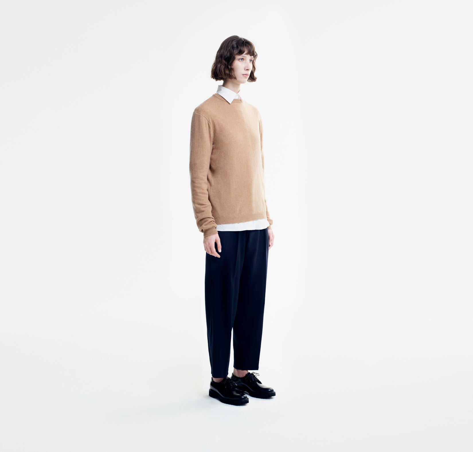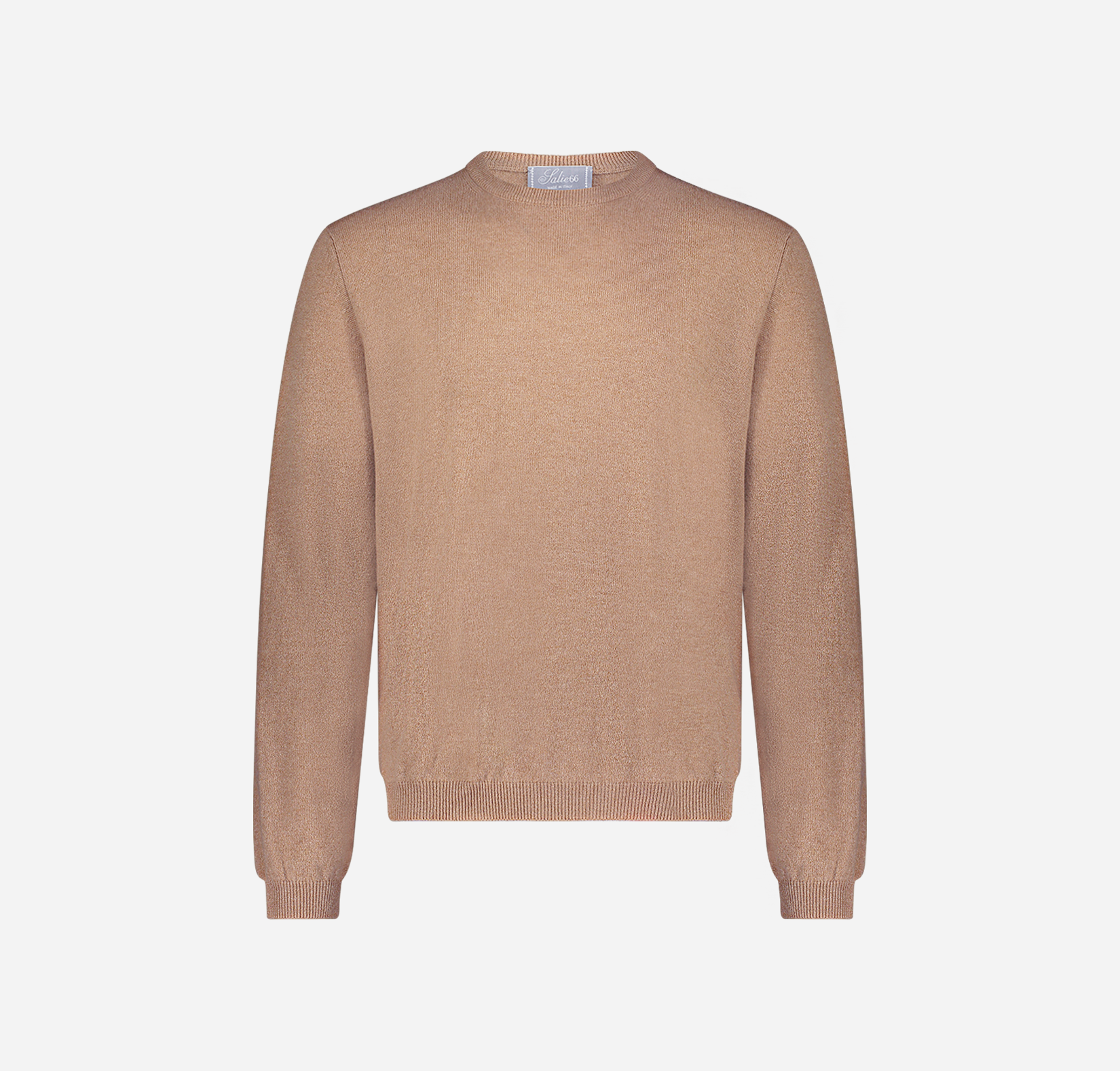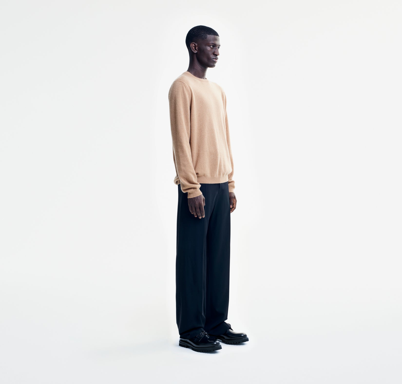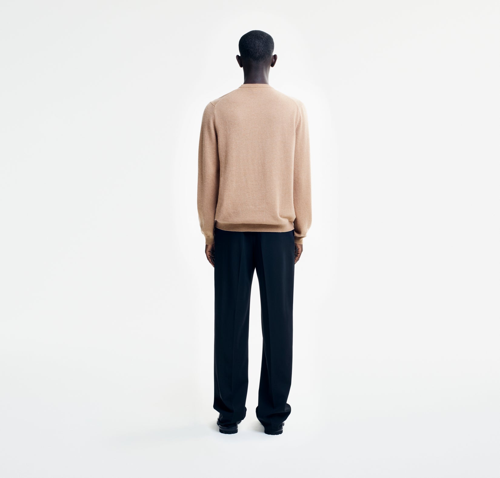 Pure cashmere crewneck sweater with ribbed collar, cuffs, and hem.