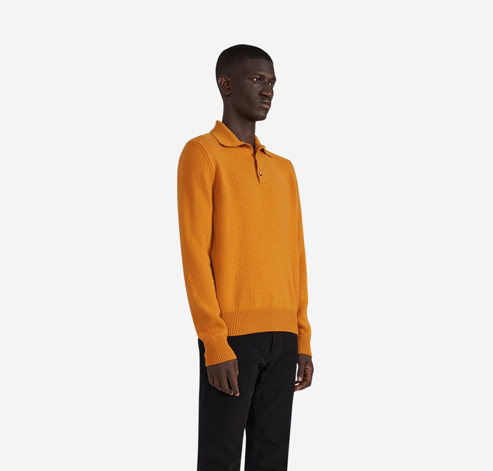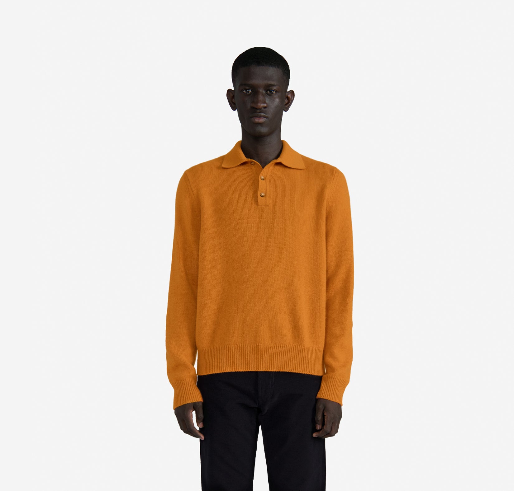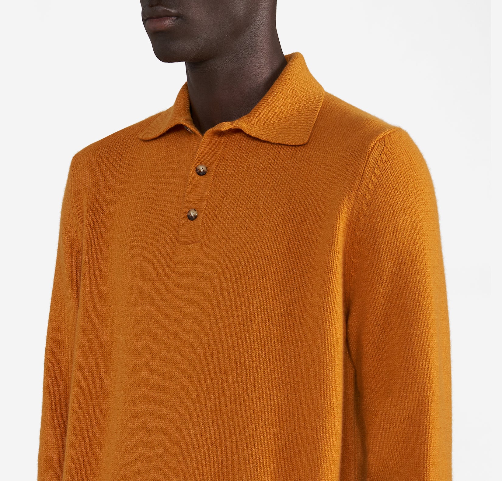 Pure cashmere polo sweater with horn buttons, and ribbed cuffs and hem.