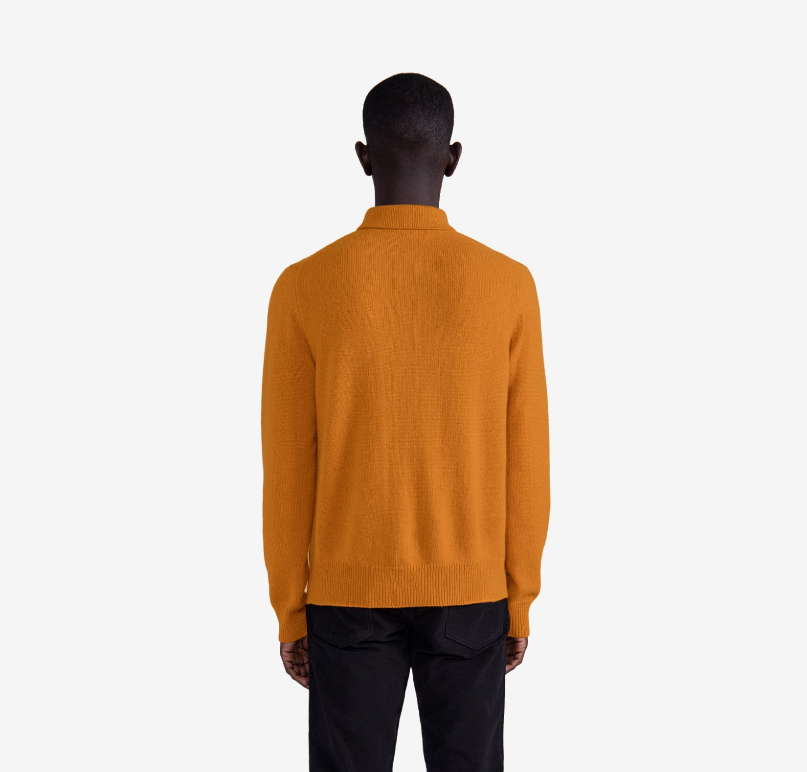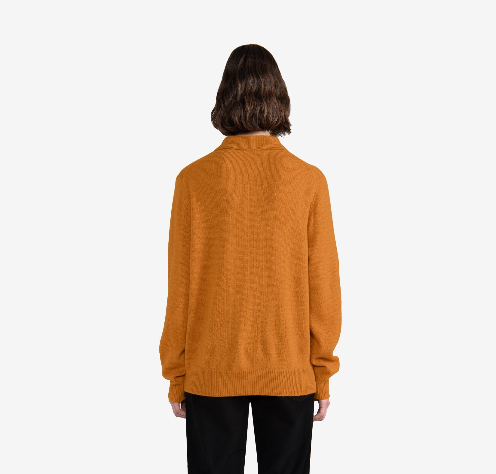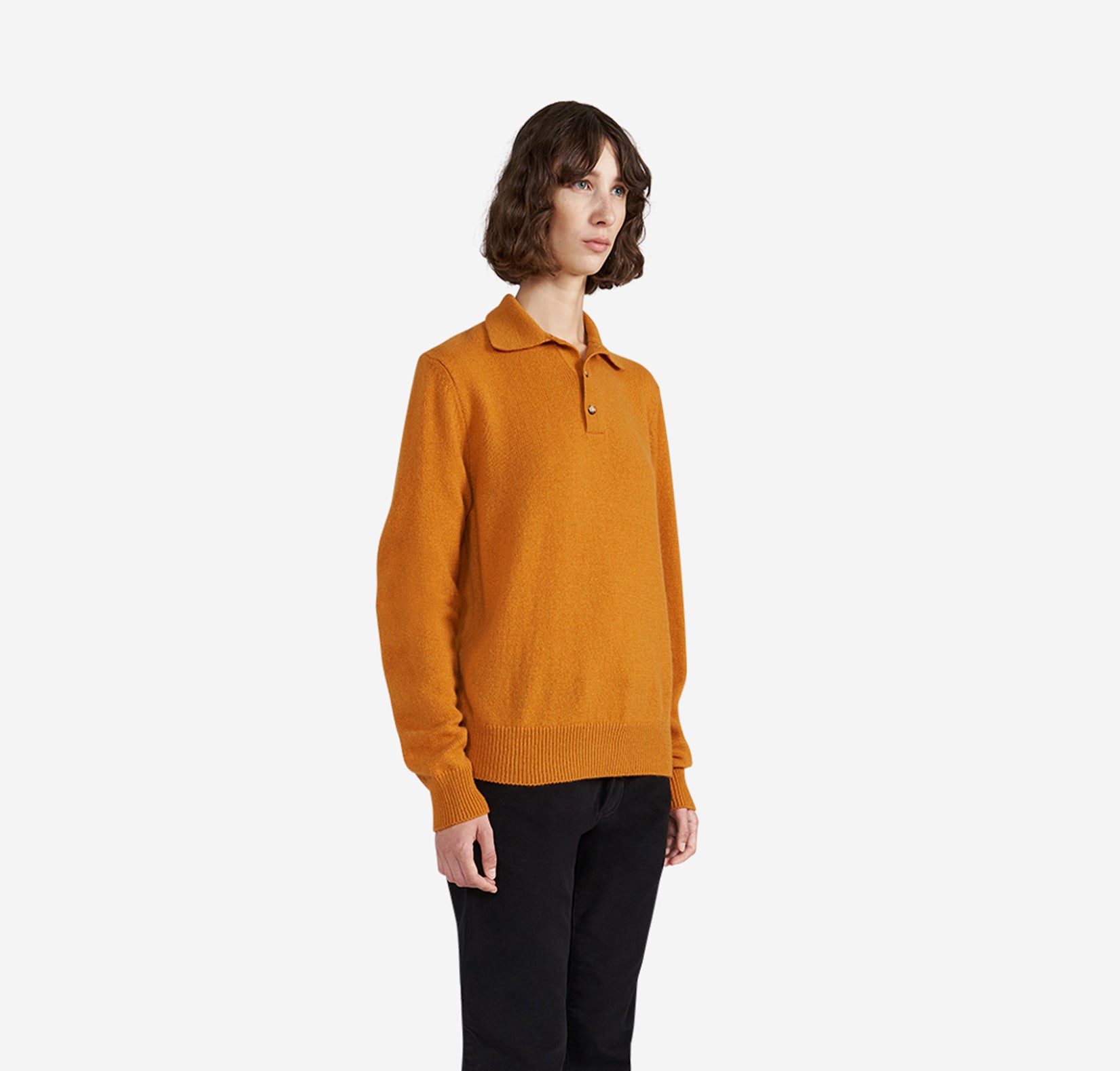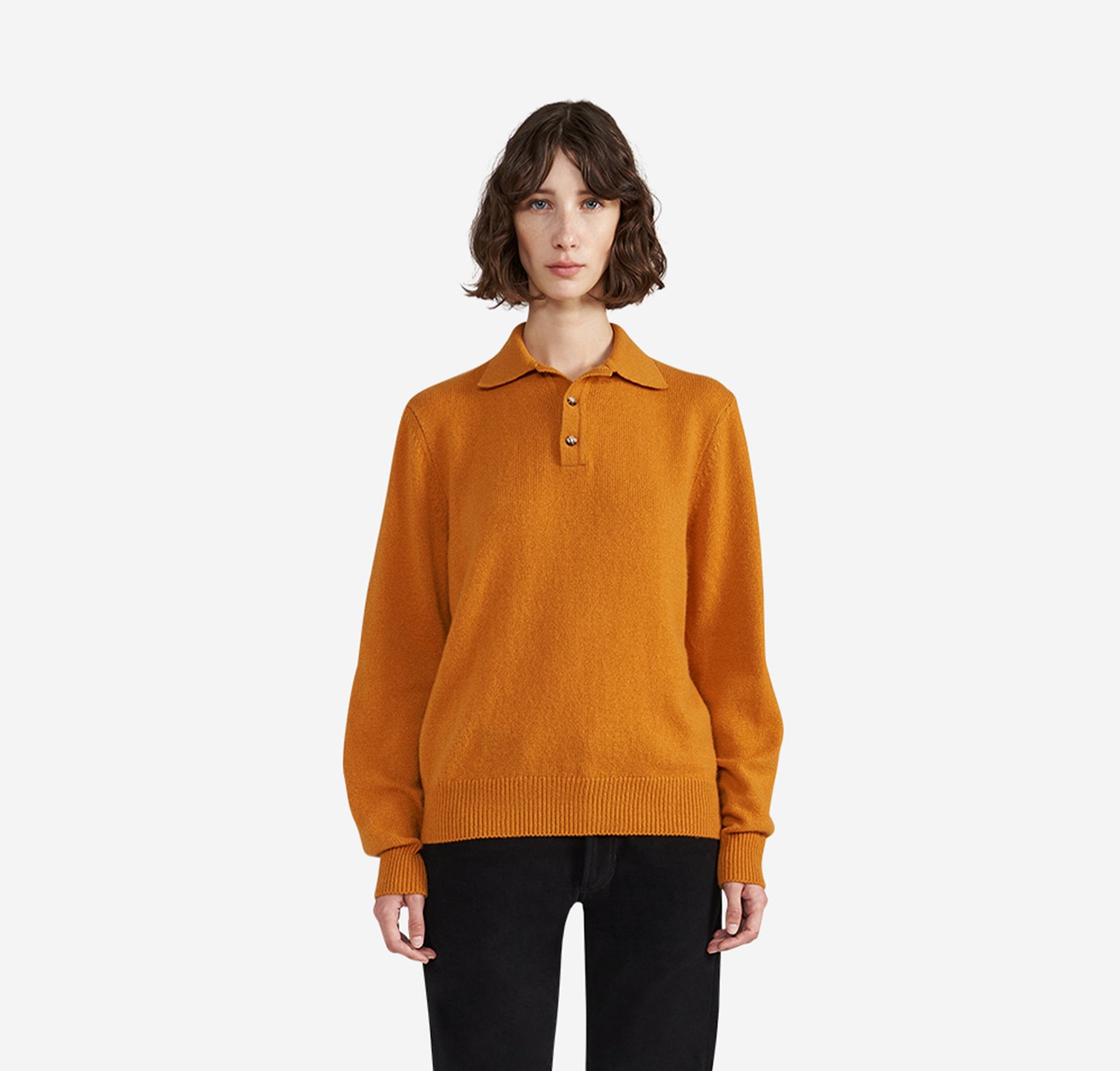 Pure cashmere polo sweater with horn buttons, and ribbed cuffs and hem.