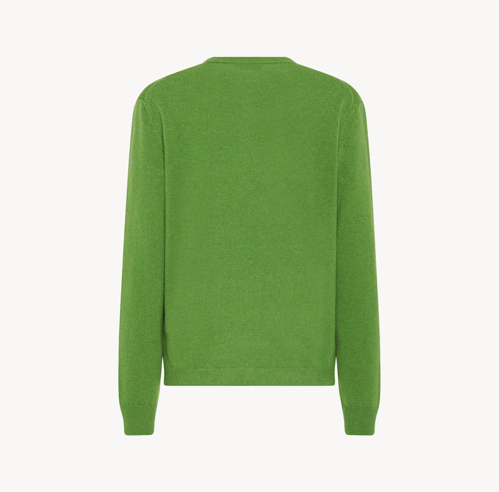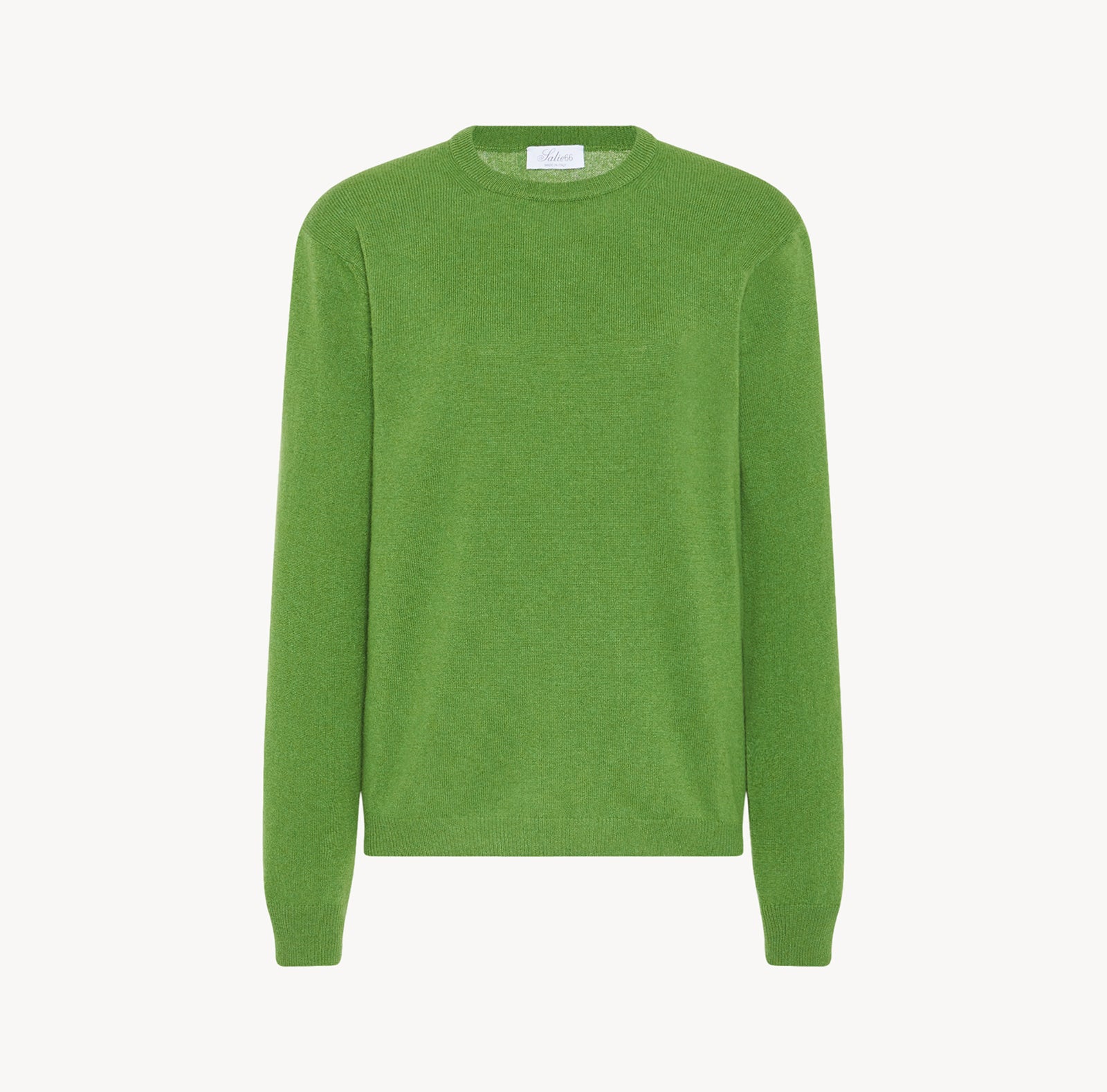 Pure cashmere crewneck sweater with ribbed collar, cuffs, and hem.