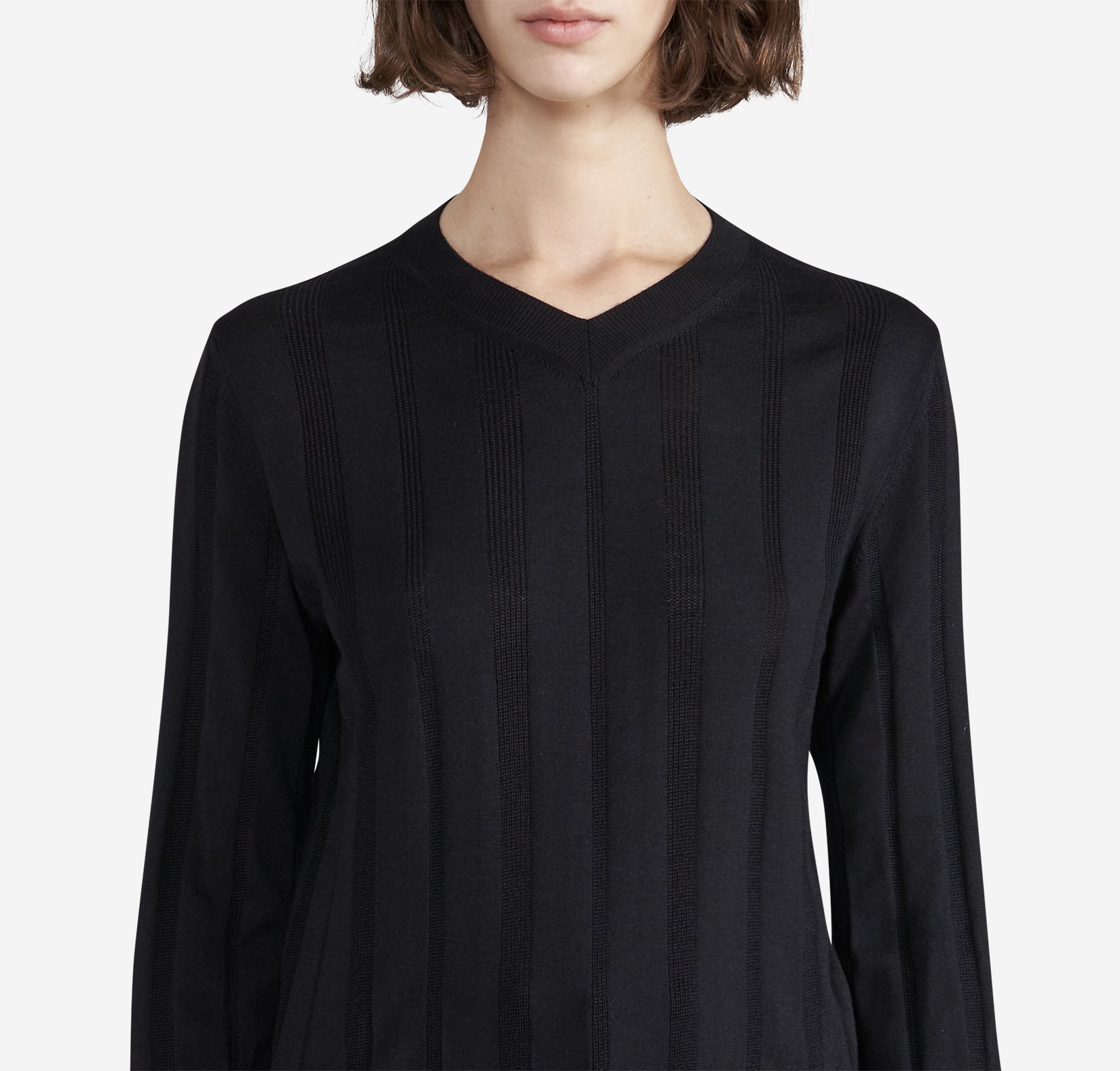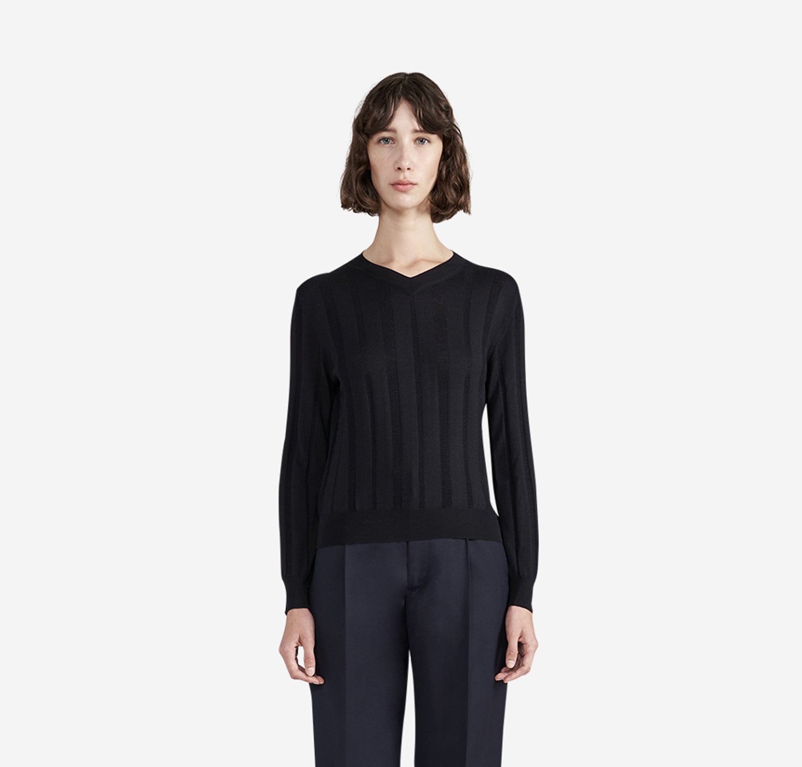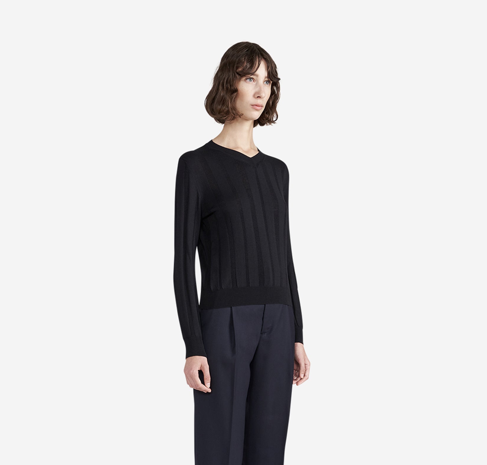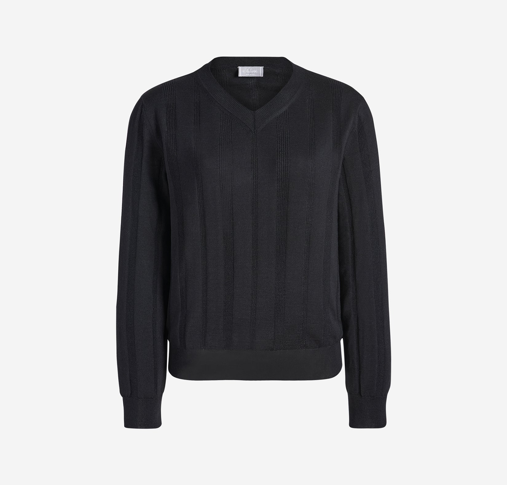 Fine knit V-neck sweater with drop stitch detail, and ribbed cuff and hem.
