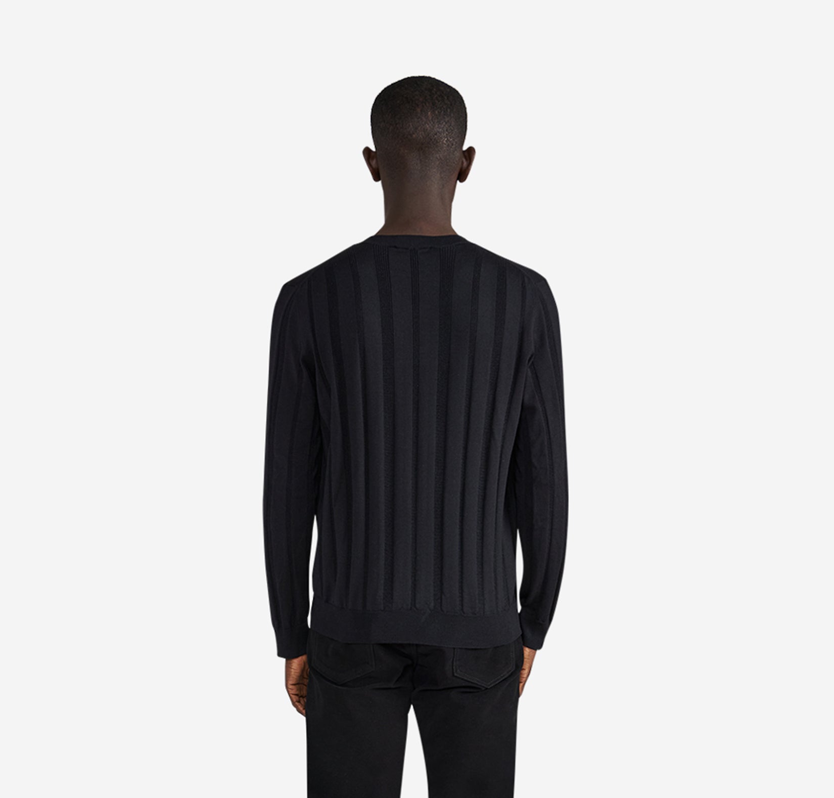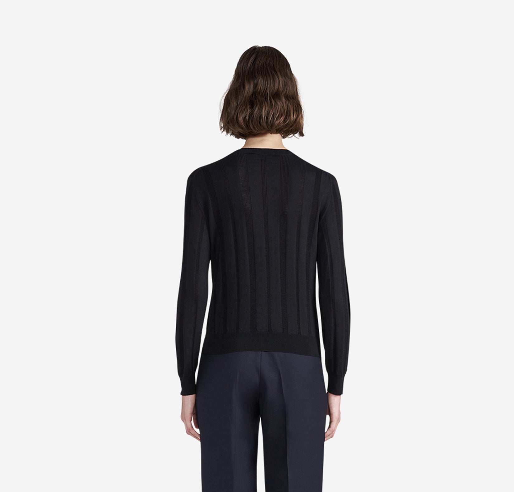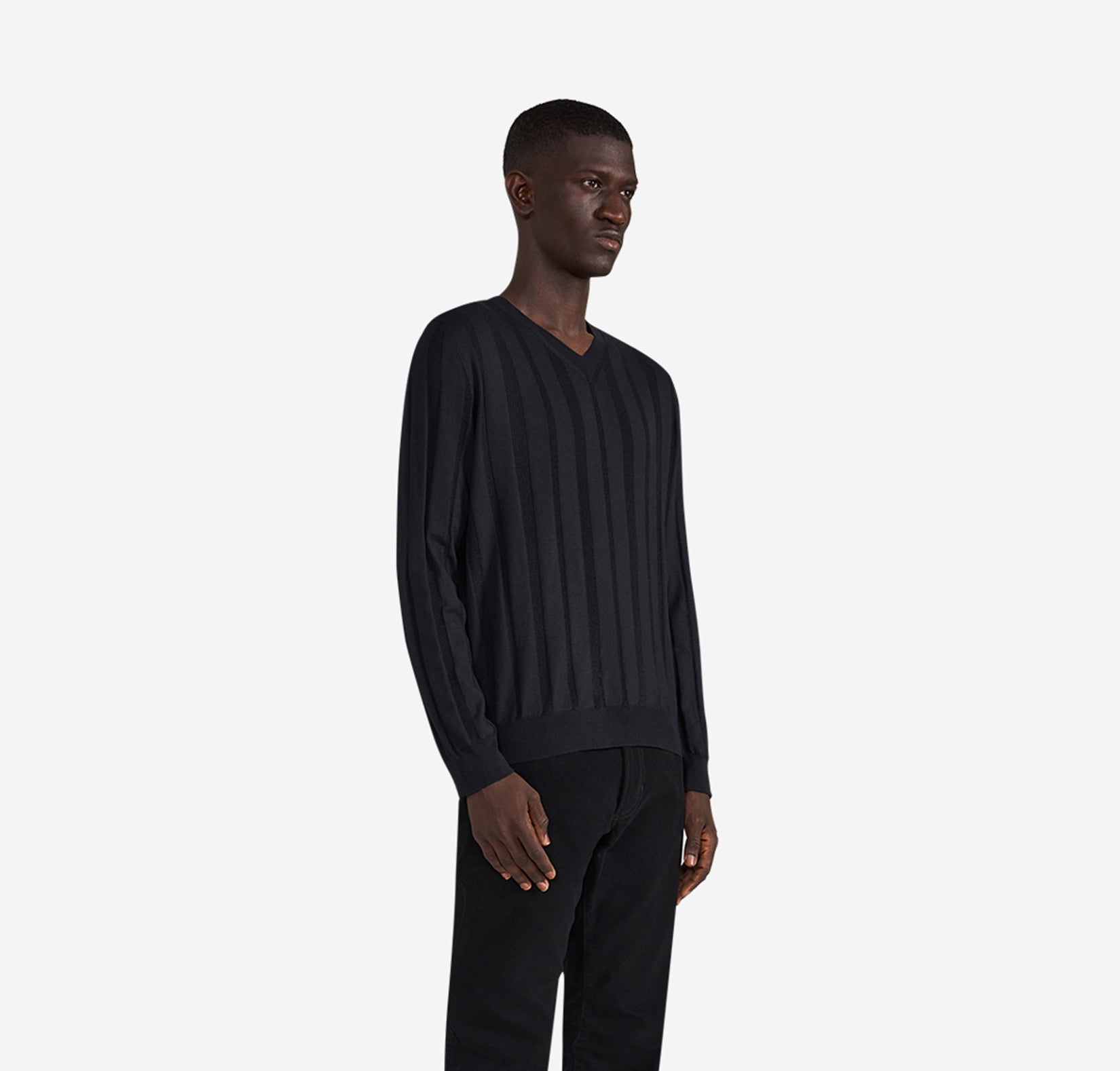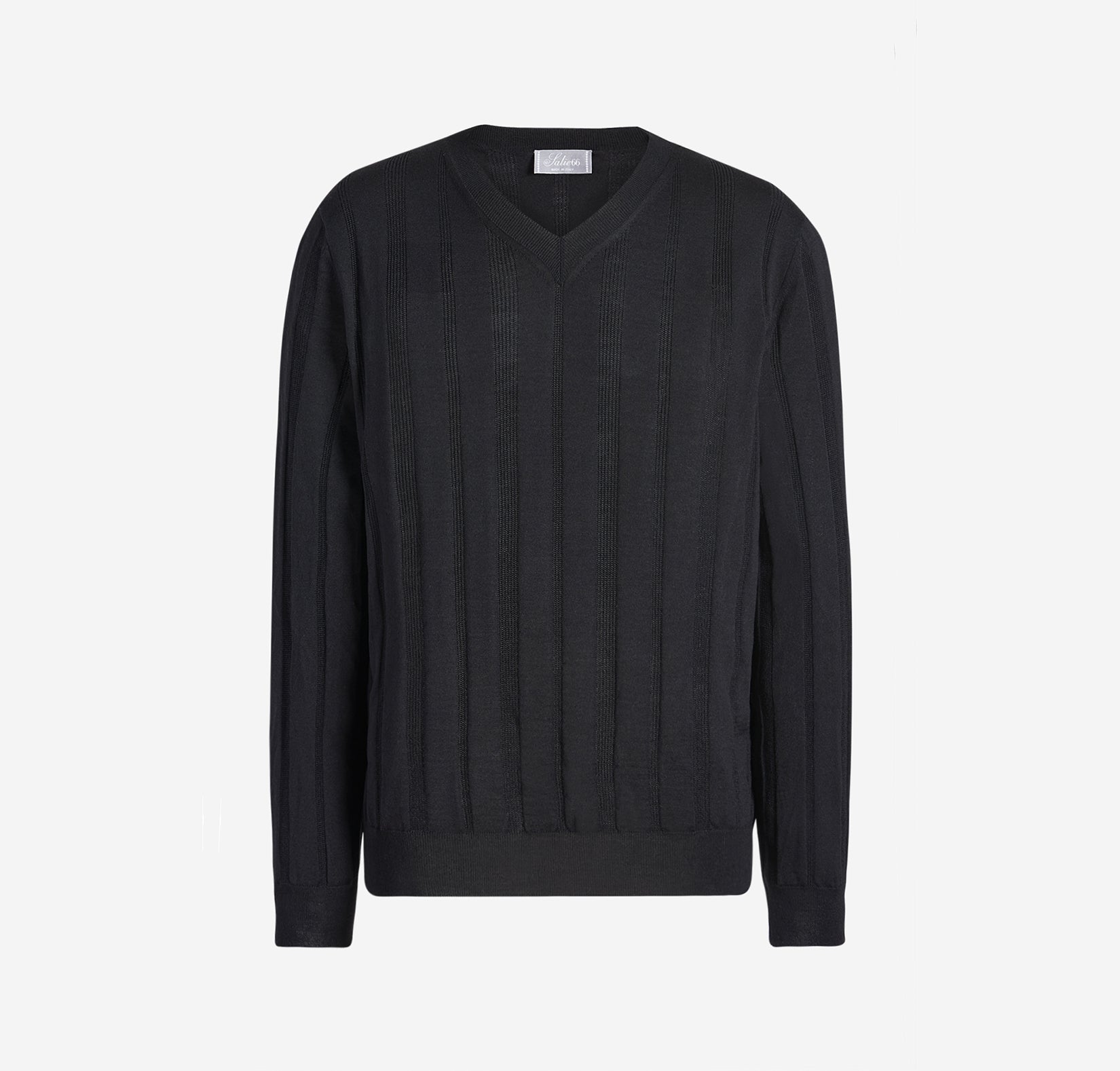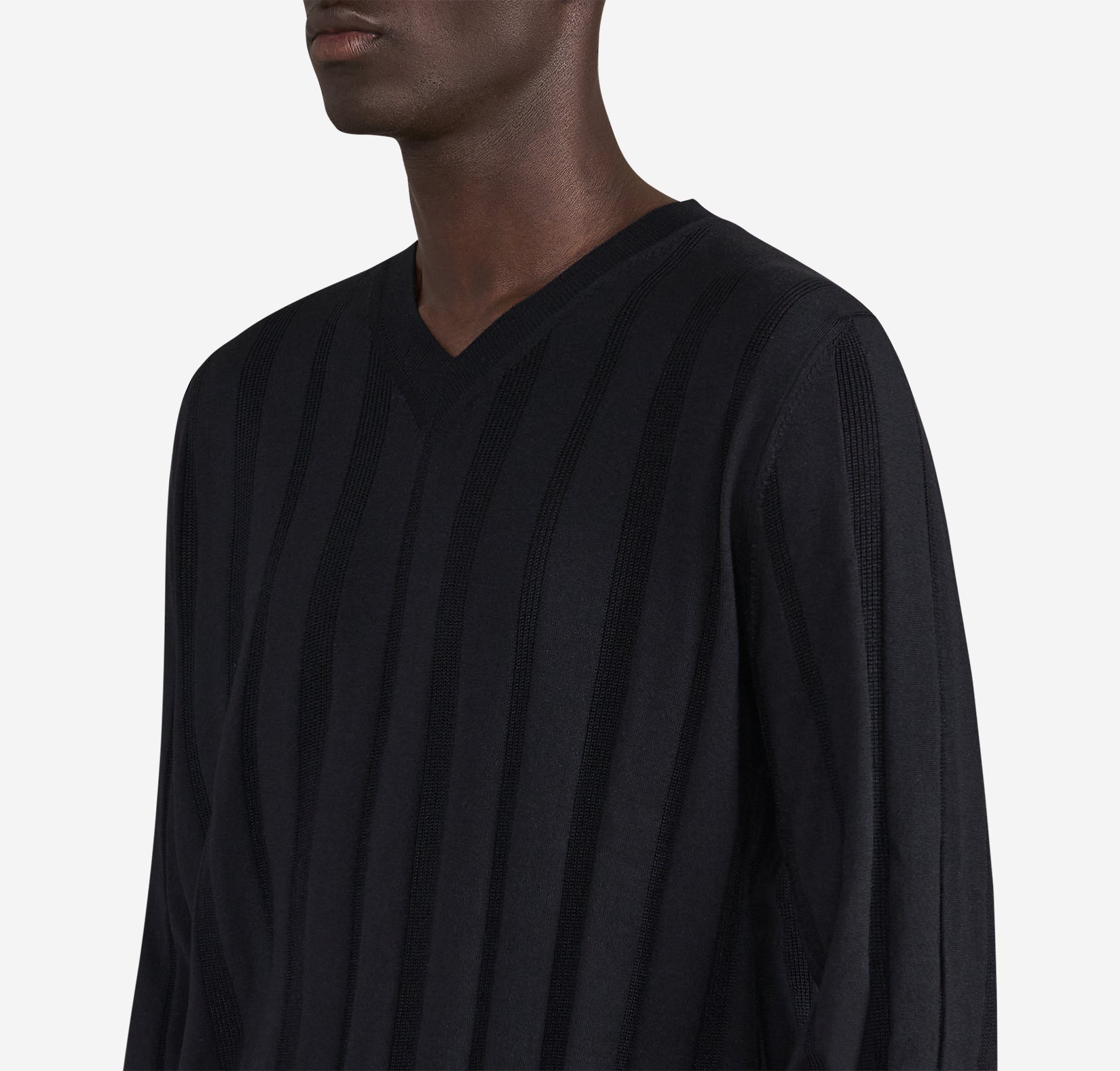 Fine knit V-neck sweater with drop stitch detail, and ribbed cuff and hem.