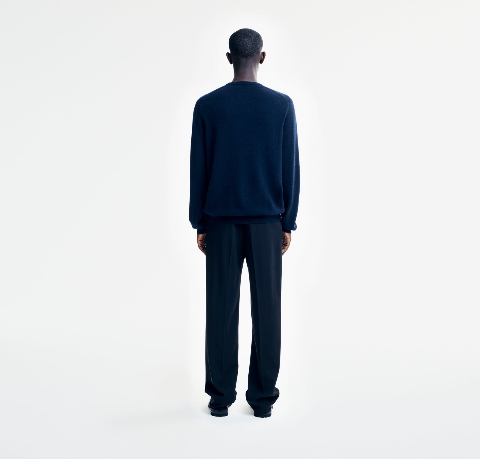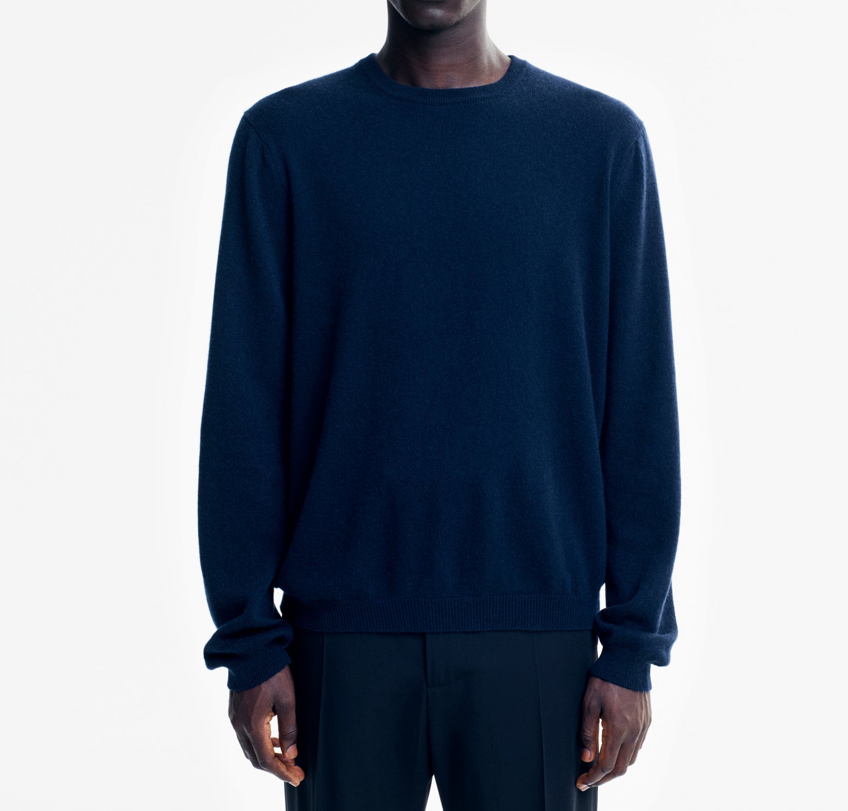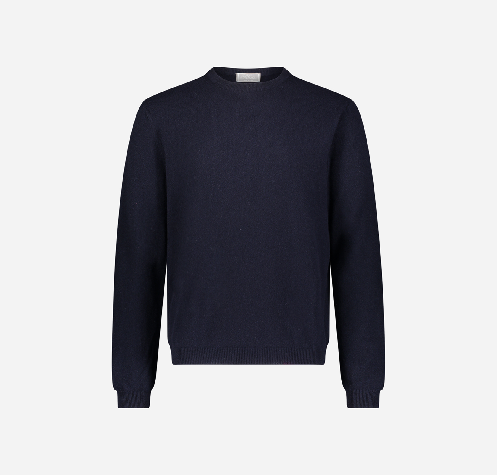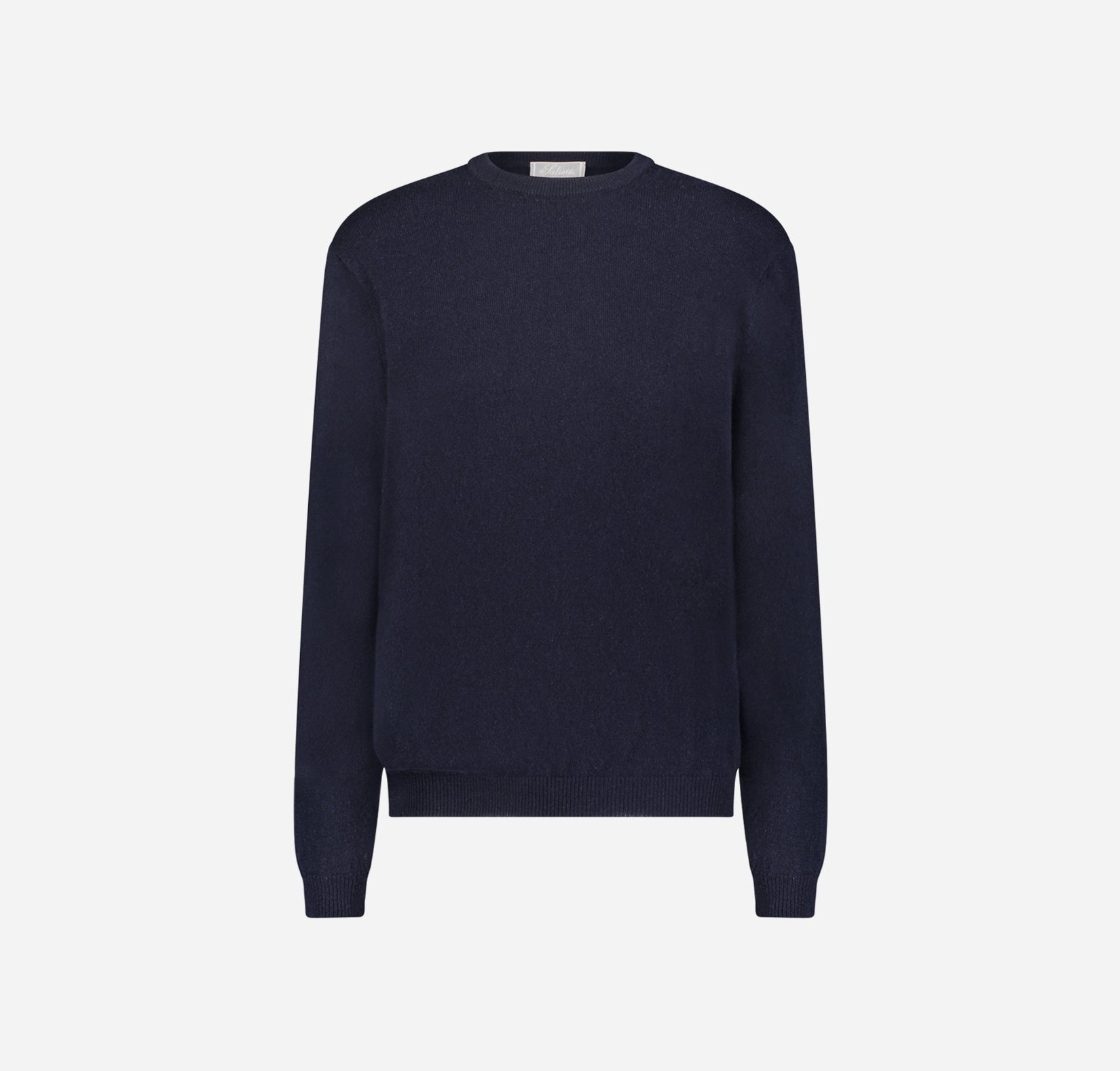 Pure cashmere crewneck sweater with ribbed collar, cuffs, and hem.