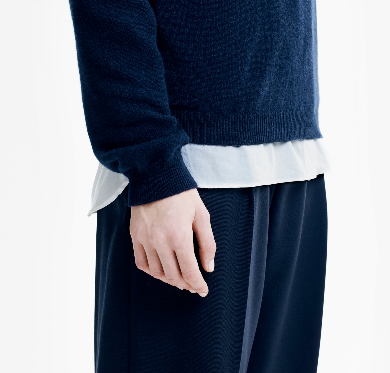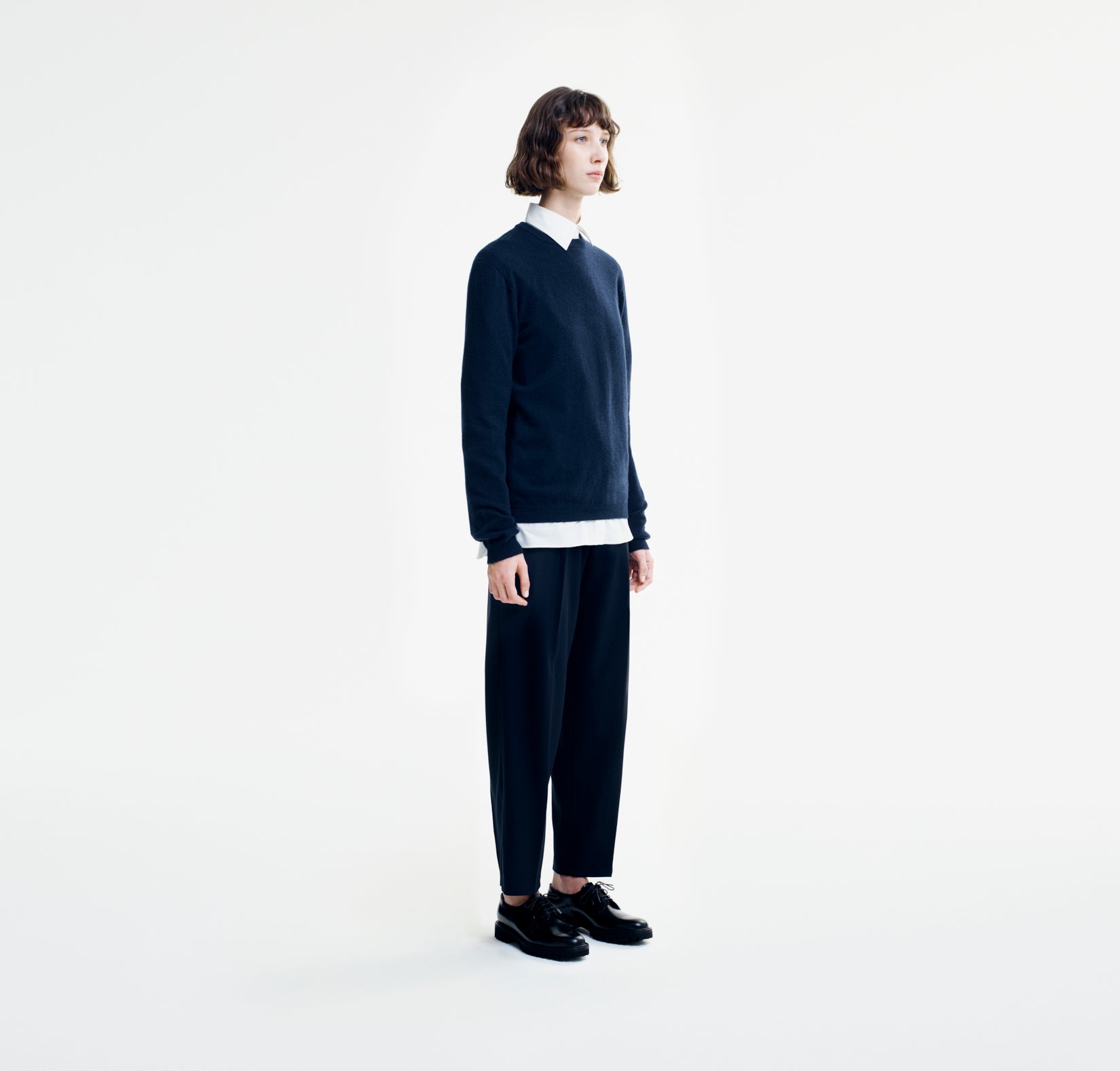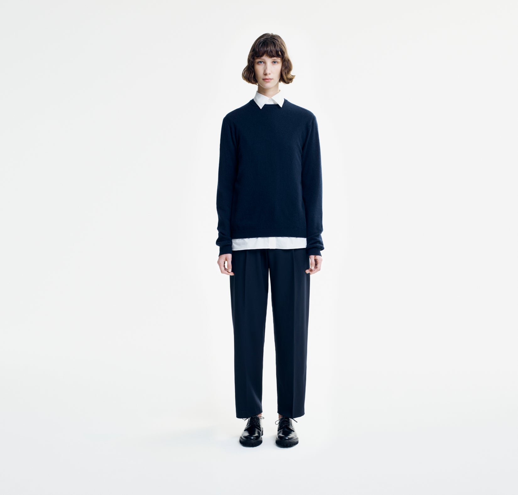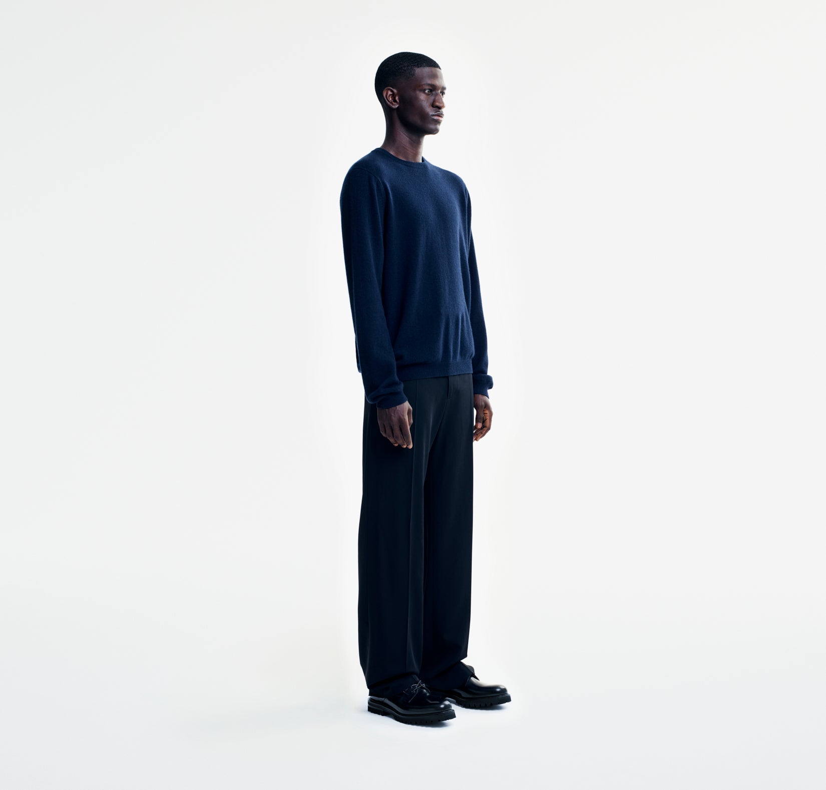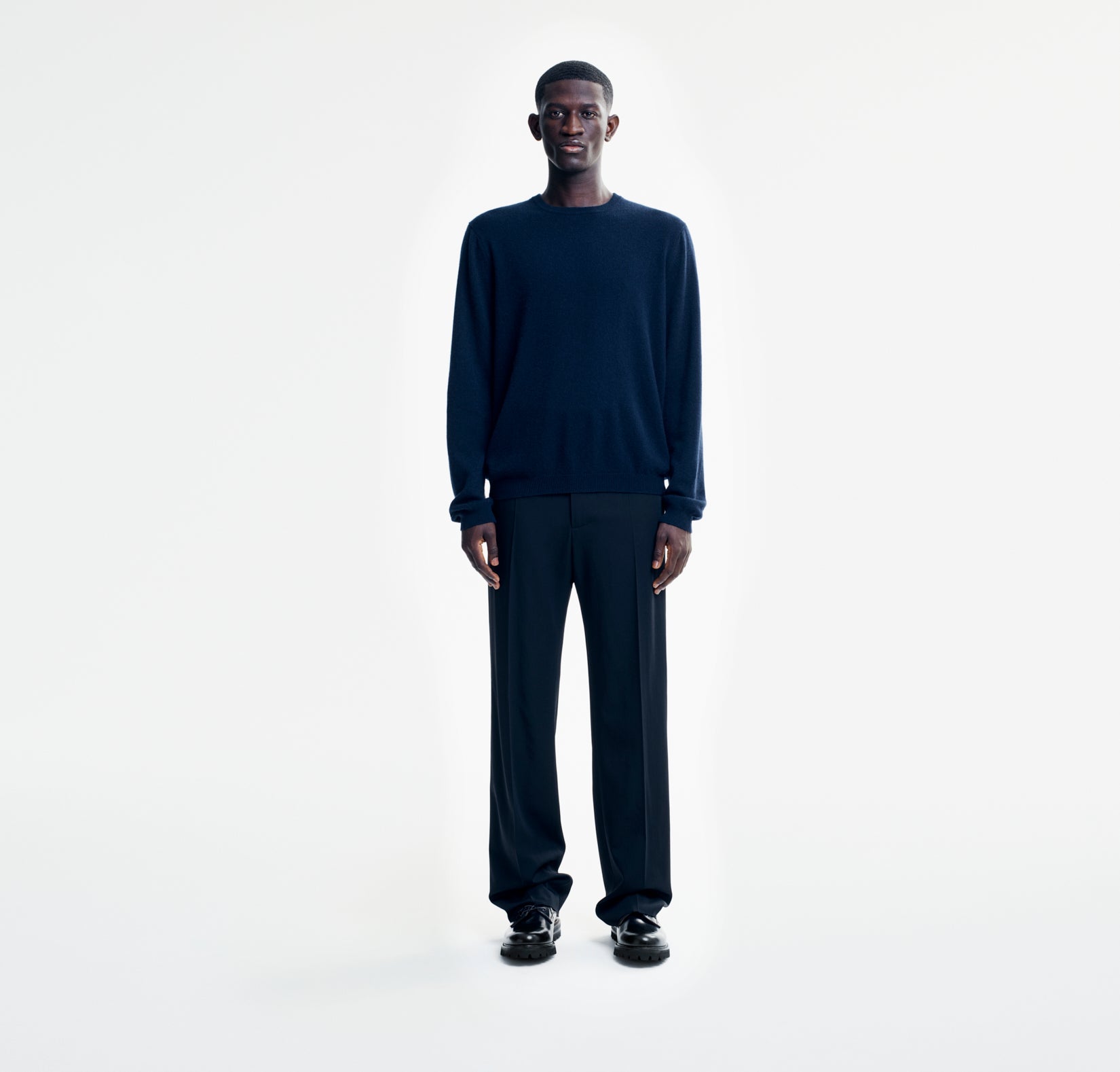 Pure cashmere crewneck sweater with ribbed collar, cuffs, and hem.