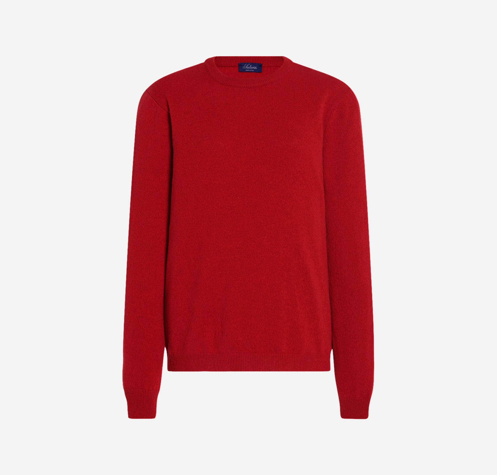 Pure cashmere crewneck sweater with ribbed collar, cuffs, and hem.