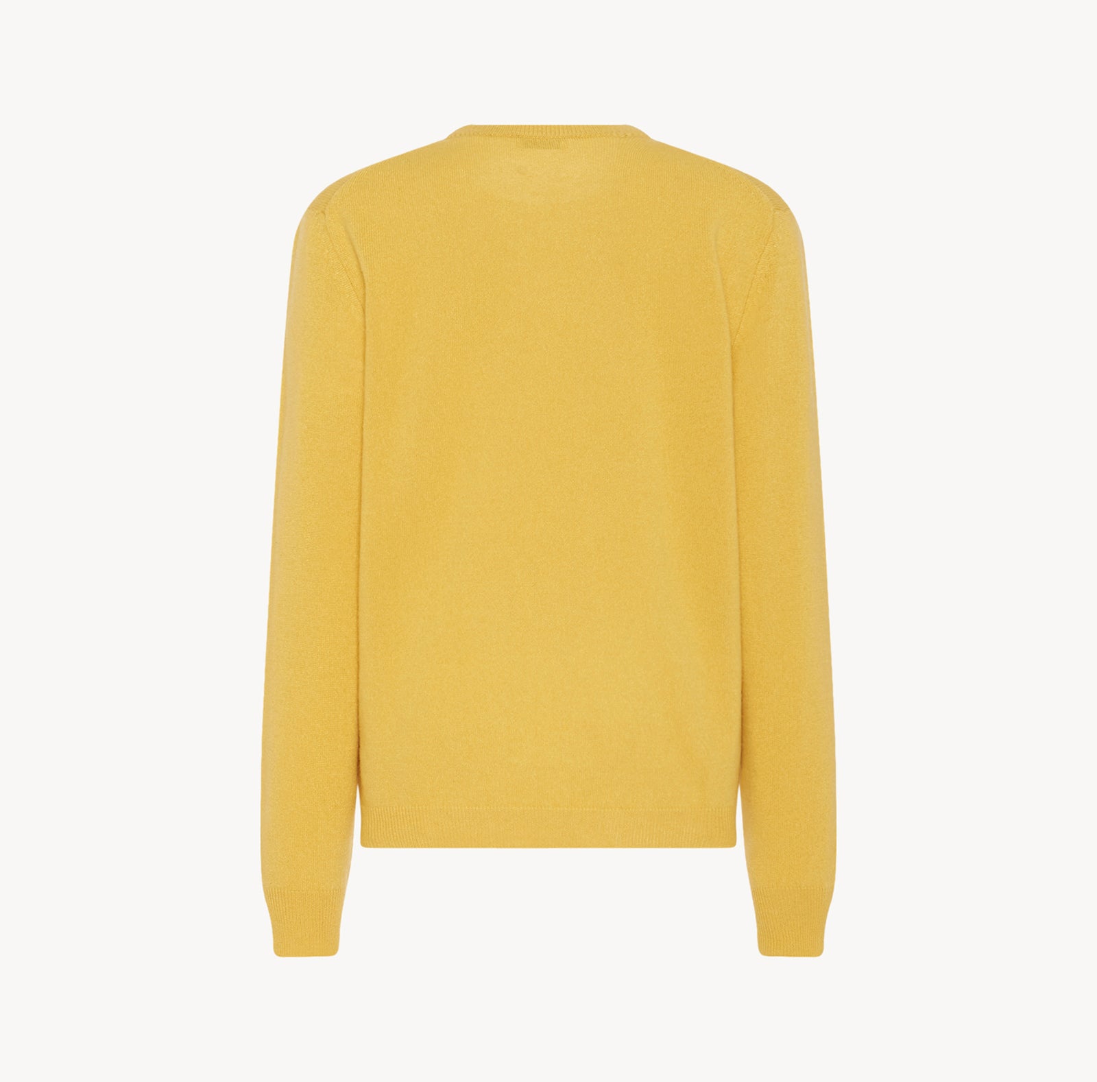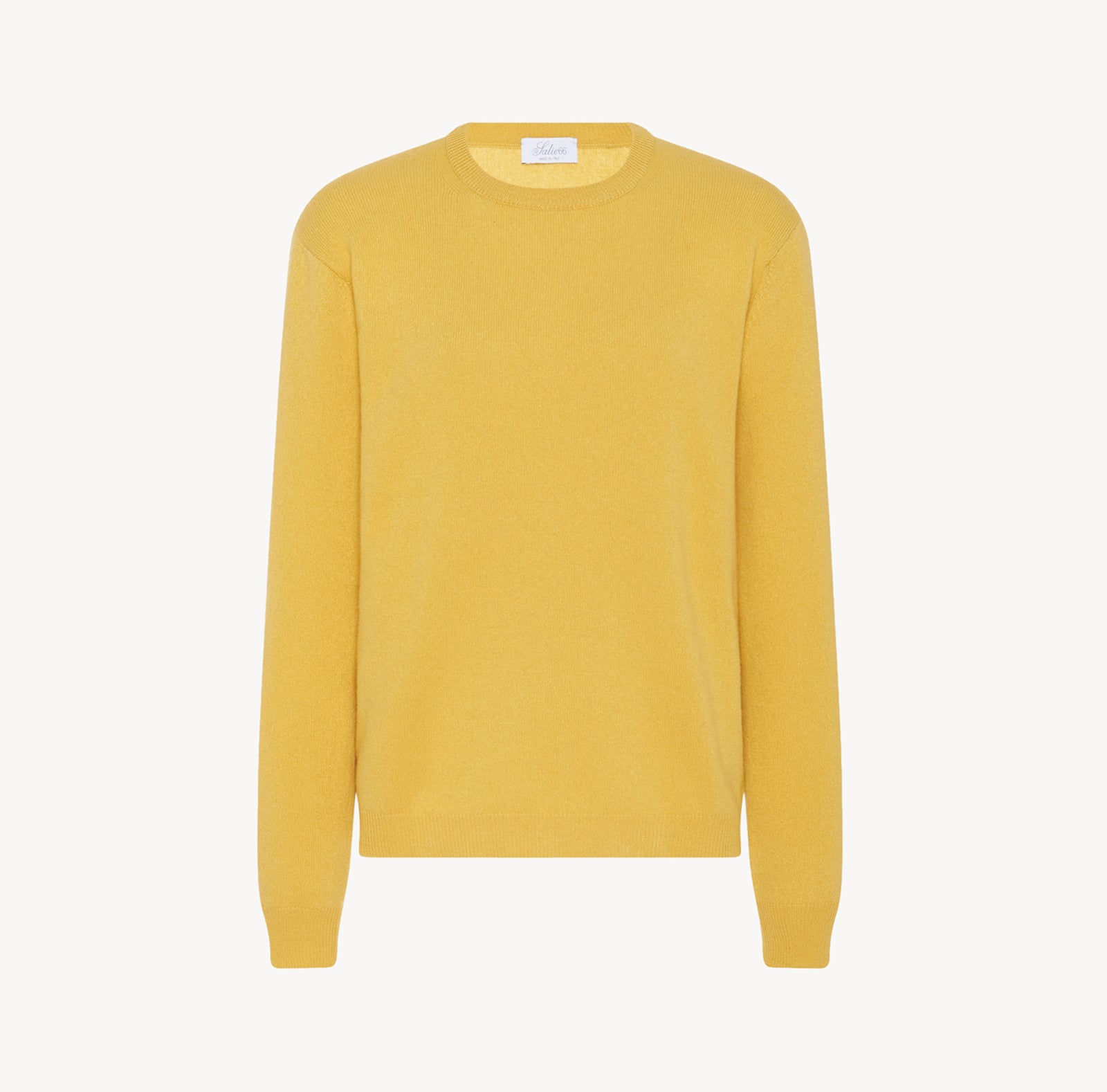 Pure cashmere crewneck sweater with ribbed collar, cuffs, and hem.