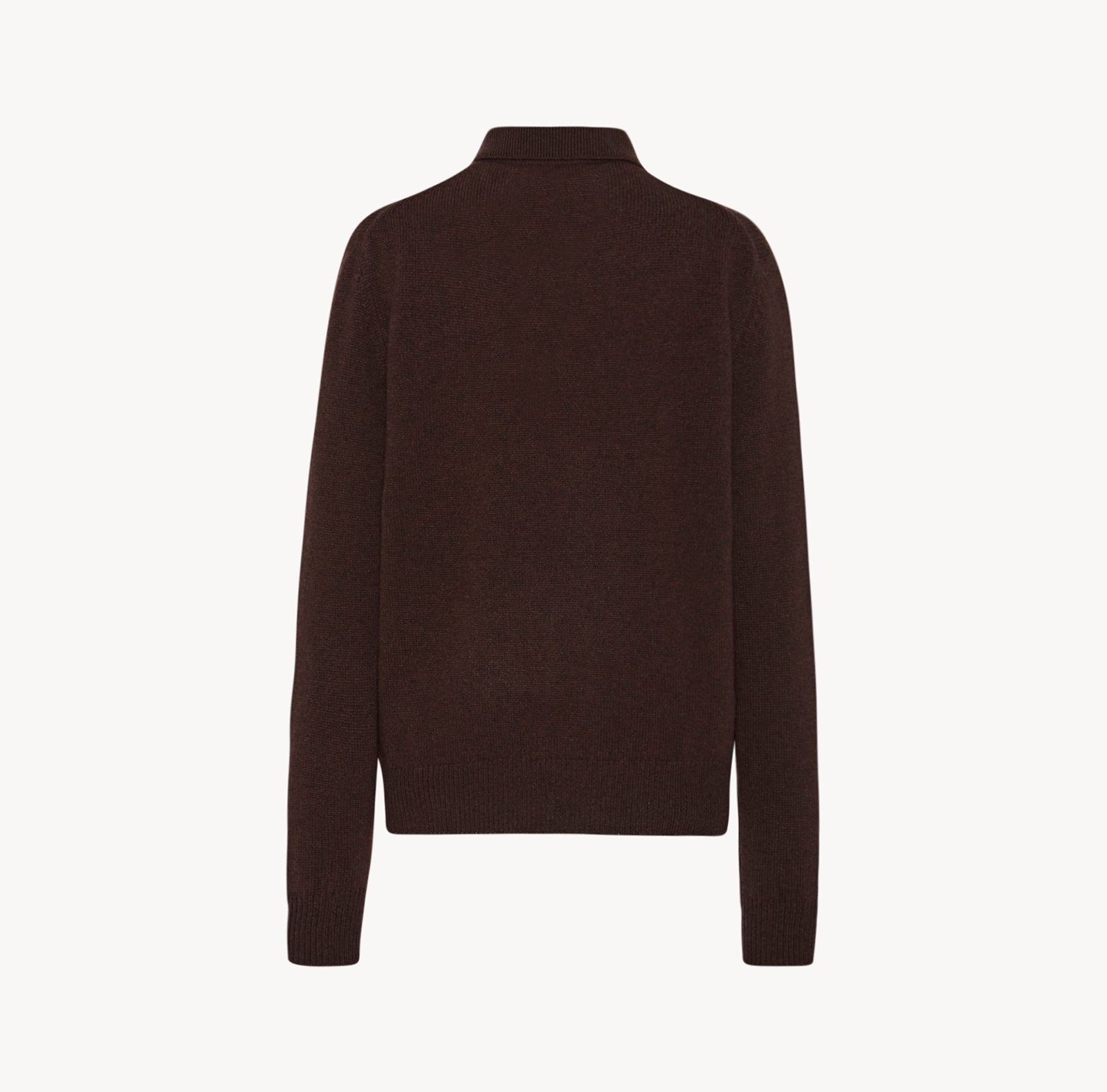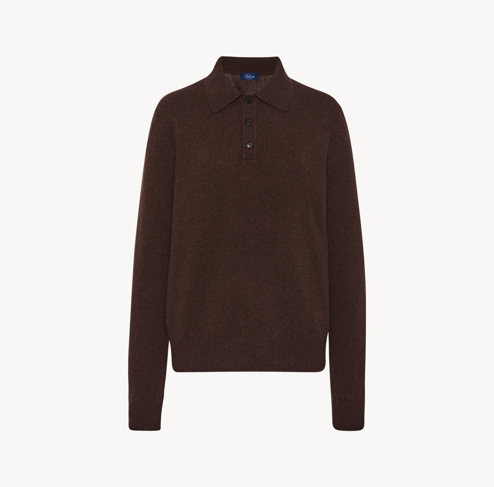Pure cashmere polo sweater with horn buttons, and ribbed cuffs and hem.