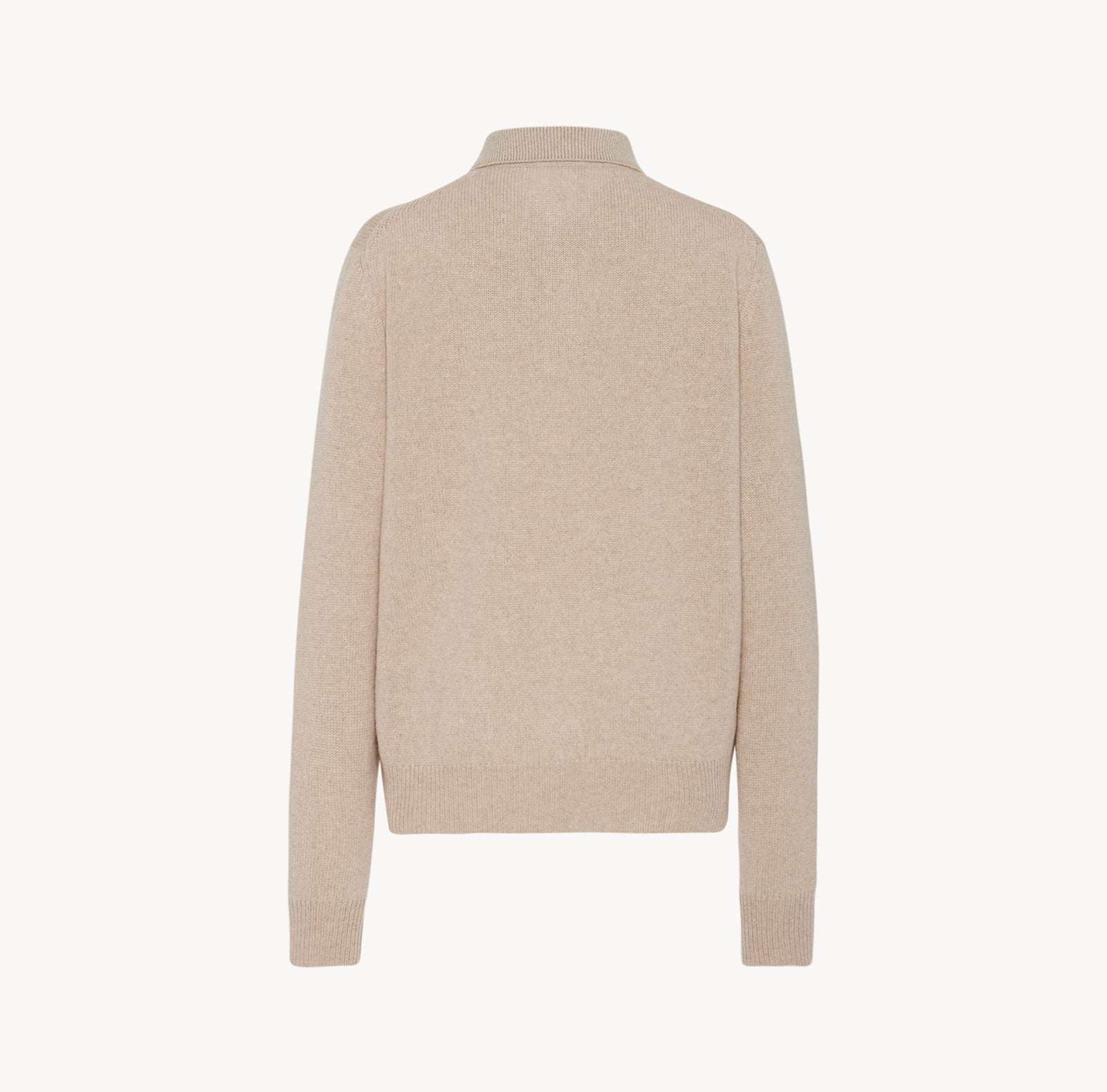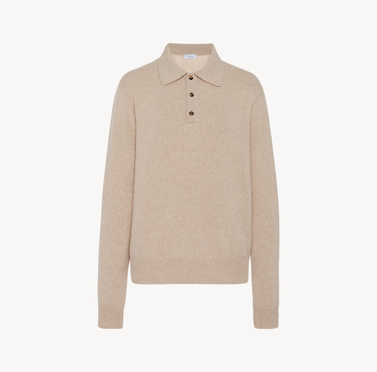 Pure cashmere polo sweater with horn buttons, and ribbed cuffs and hem.